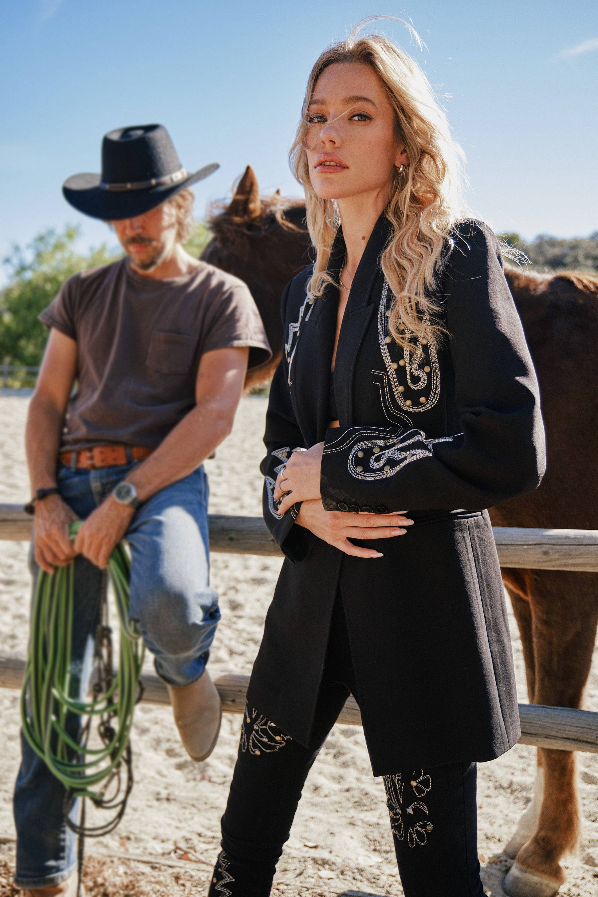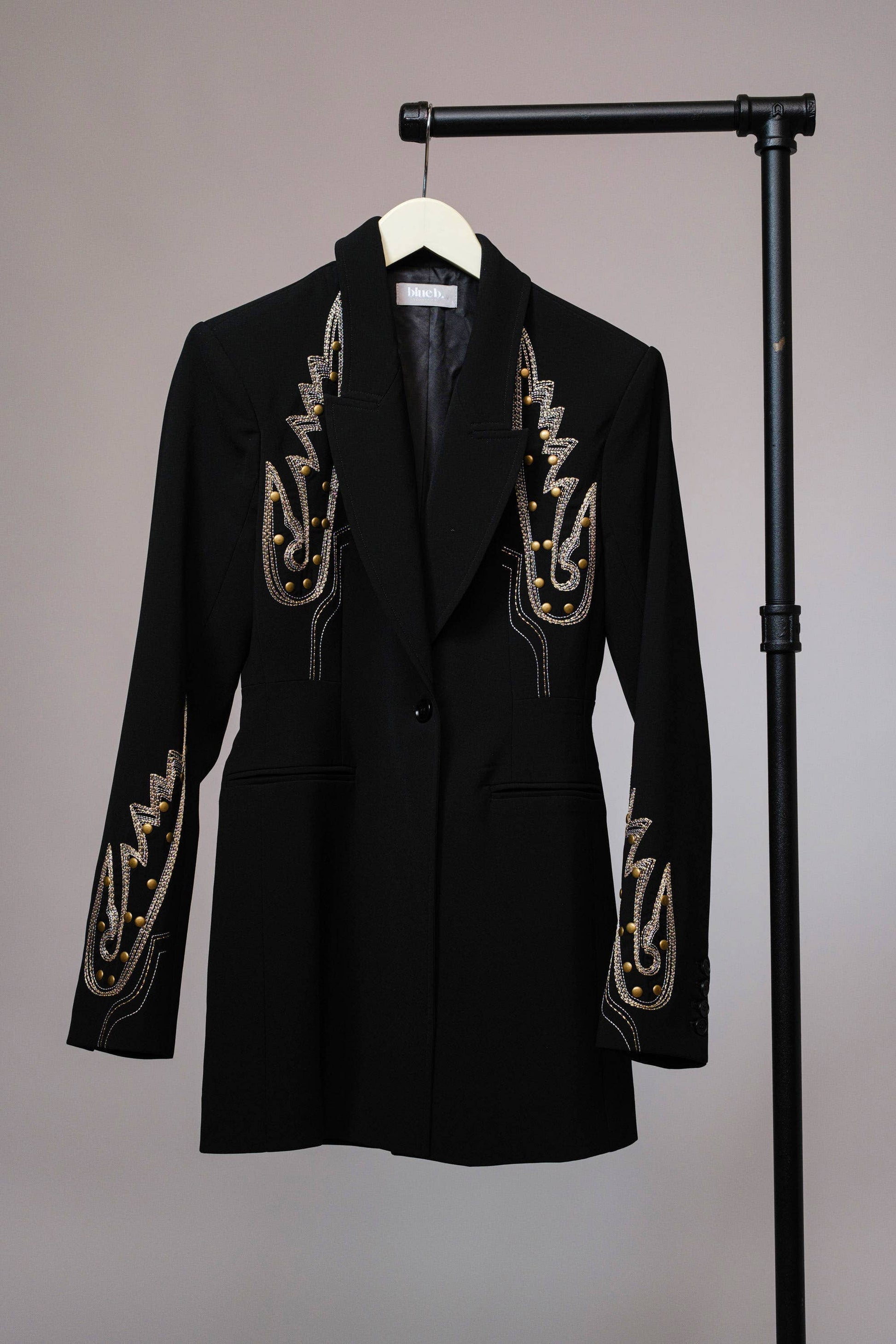 Single tunic blazer with boots stitch embroidery and studded details. Made from stretch woven suiting fabric for a polished look.