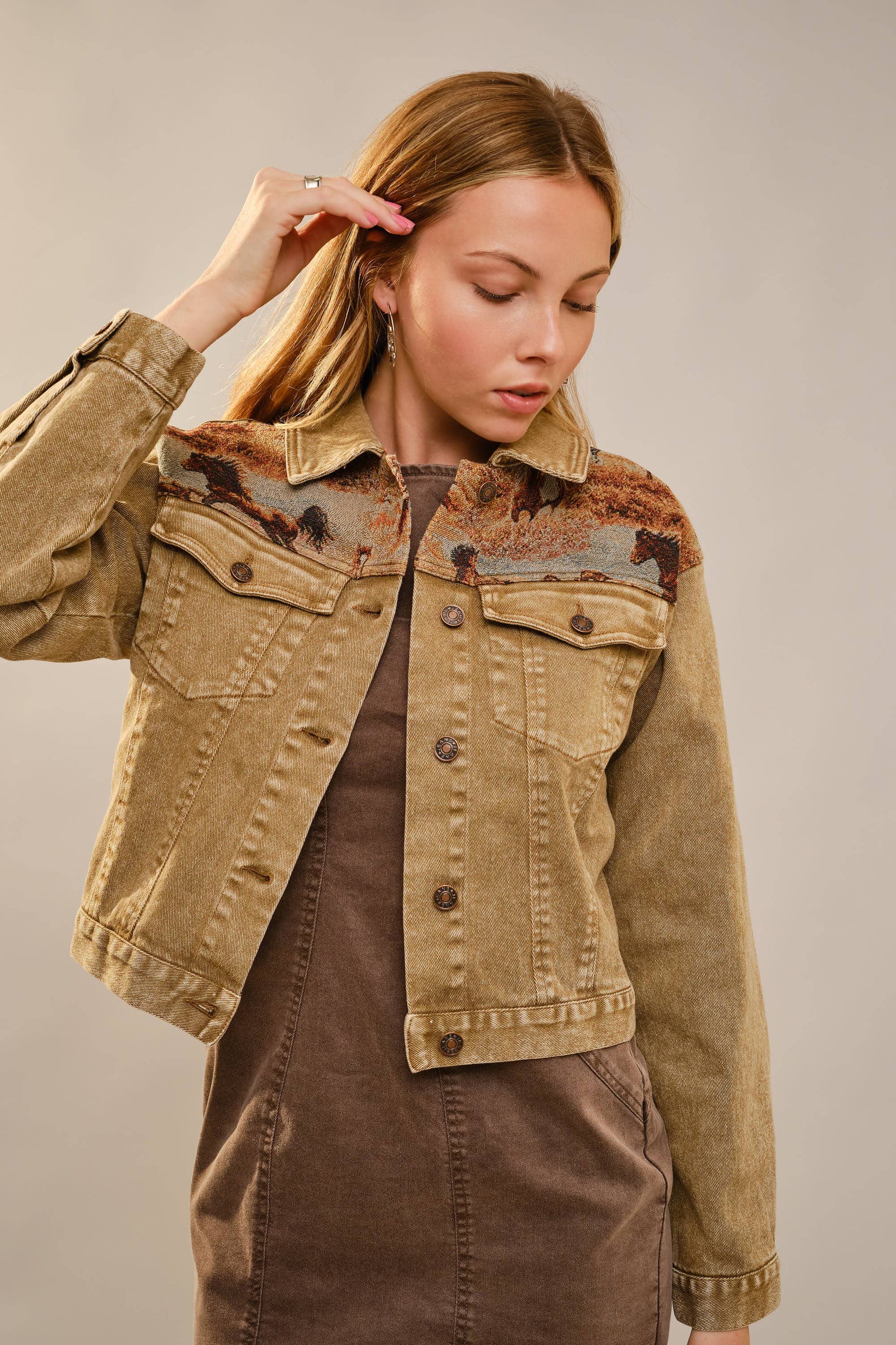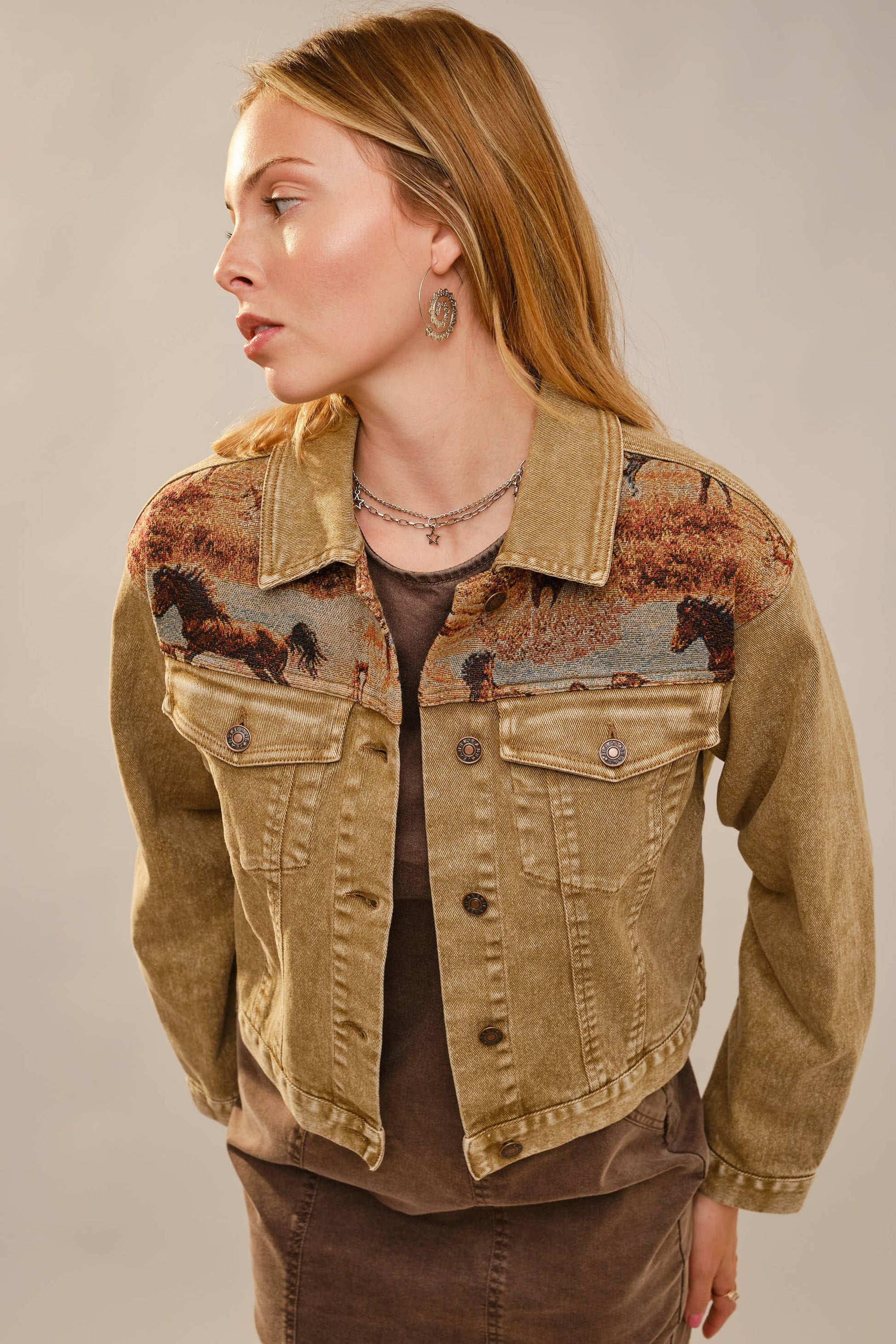 Cropped denim jacket with button-front closure, chest flap pockets, and woven horse tapestry panels at the front yoke and back for a western-inspired look.