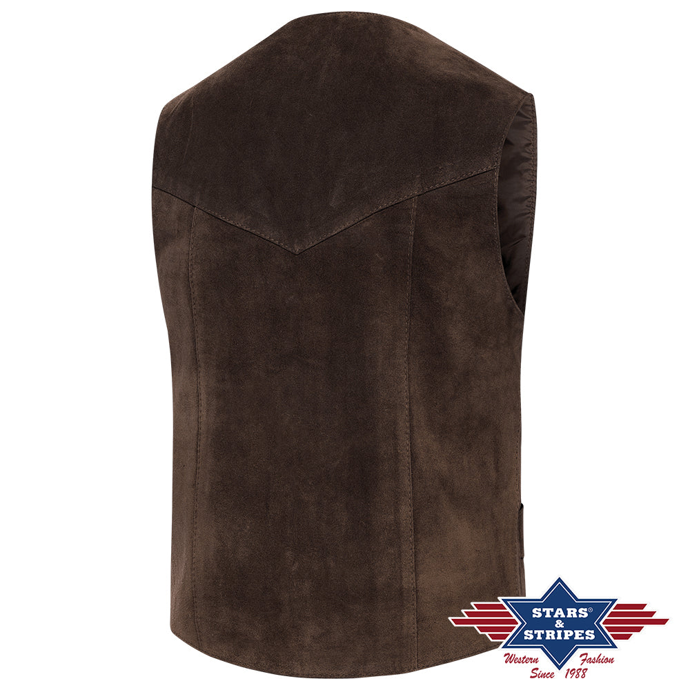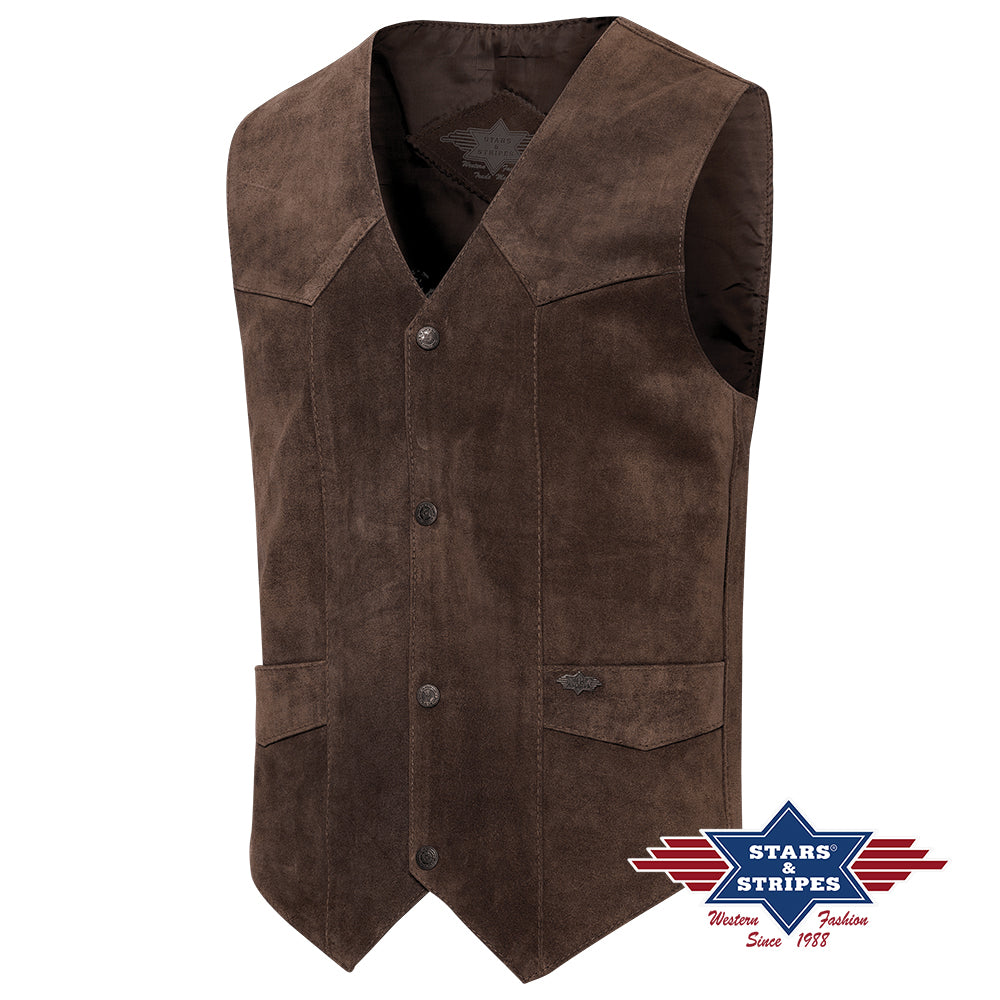 Classic vest made of high-quality suede cowhide with metal snaps. With an inner pocket, available in beige, brown, and chocolate.