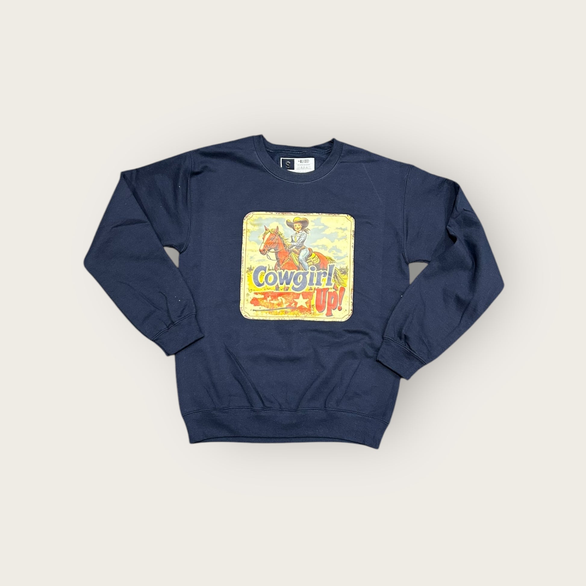 Cowgirl UP graphic Crewneck by Ali Dee features a unisex fit sweatshirt in Navy with full colour artwork on front.
