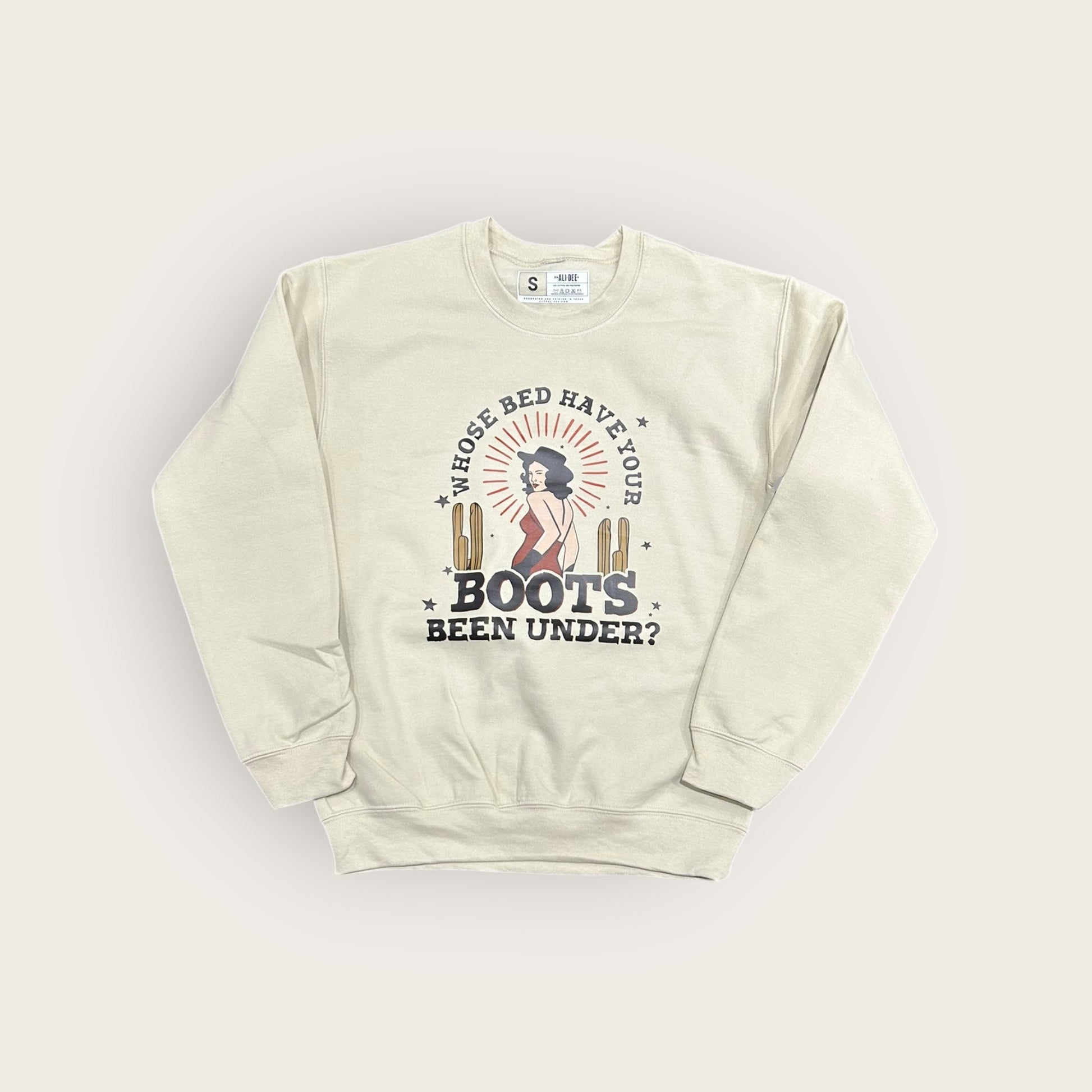 Whose Bed Have Your Boots Been Under graphic sweatshirt by Ali Dee features a unisex fit sweatshirt in sand with full colour artwork on front.