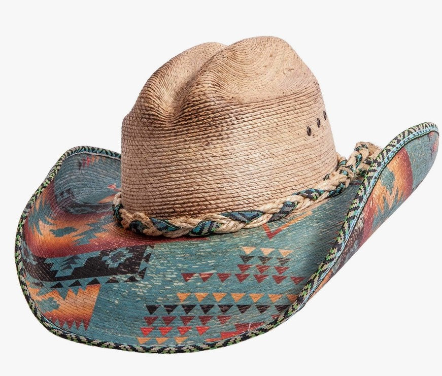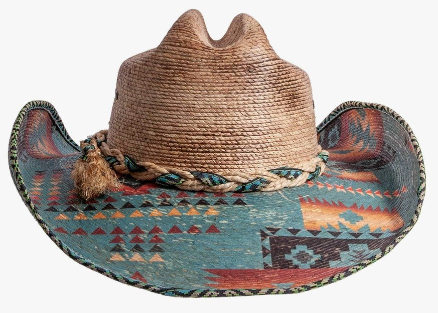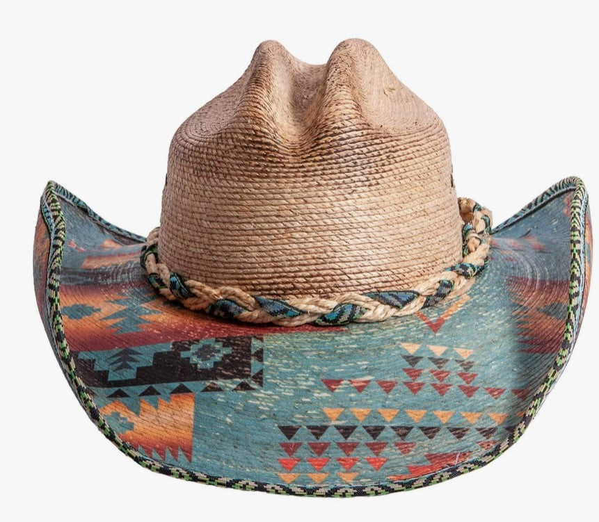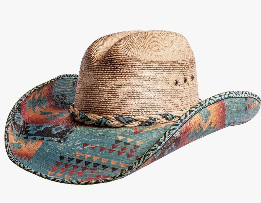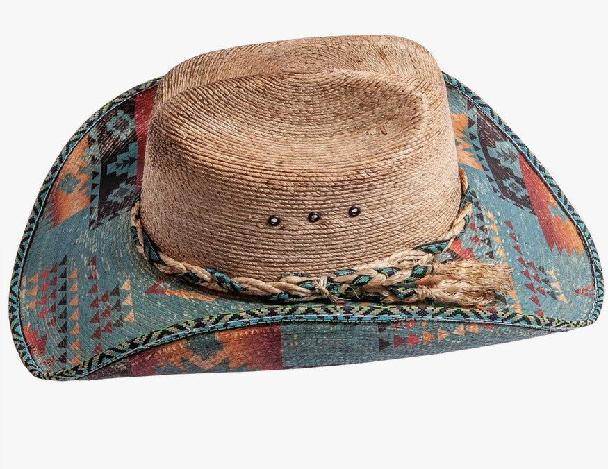 The Cassius is a strong cowboy hat with Aztec print on the brim, and a trimmed rim. A cloth and straw weaved hatband is included to complete the look