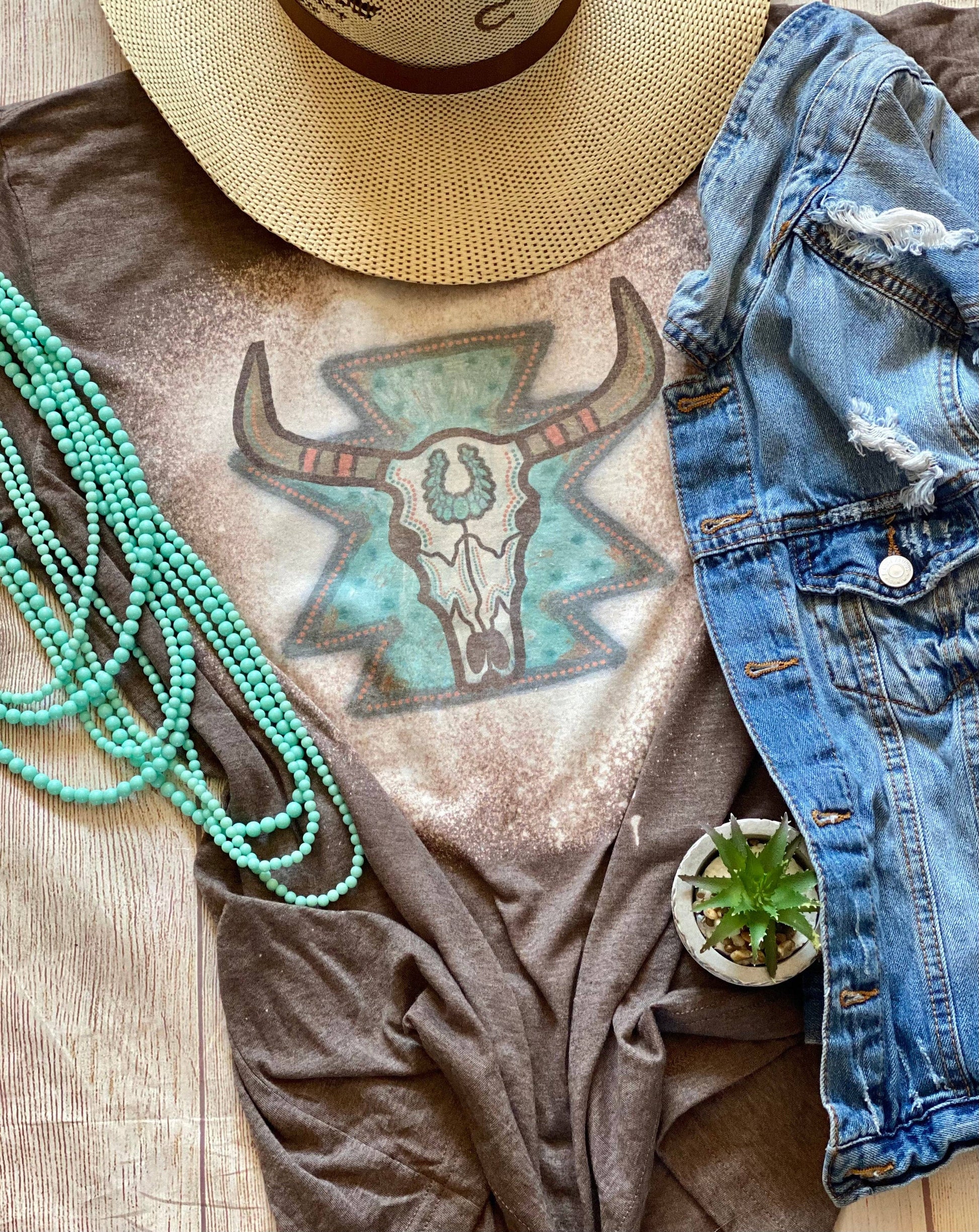 Add this fun, western tee to your closet…features a sublimation graphic on a bleached, unisex t-shirt.