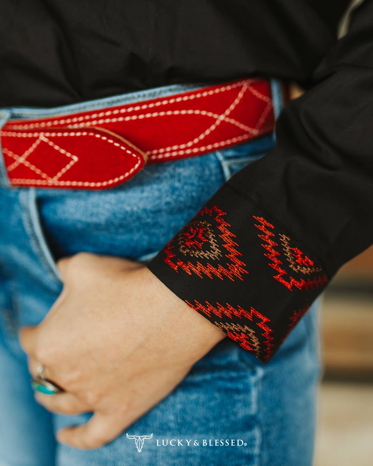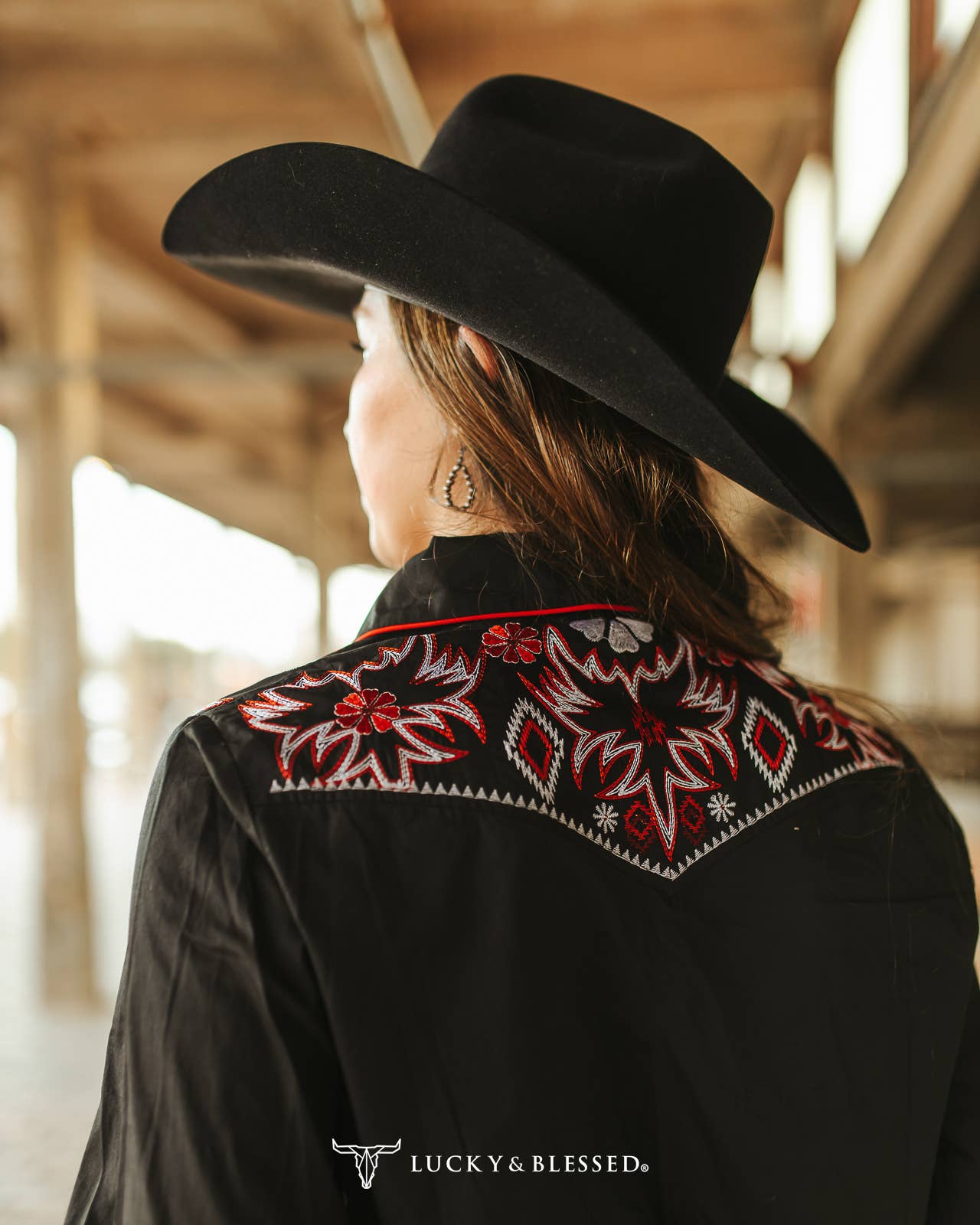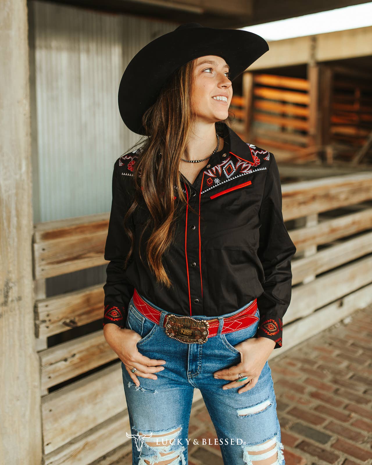 Lucky & Blessed Black Aztec Embroidered Western Yoke Pearl Snap Top TO865-BLK