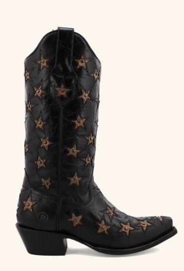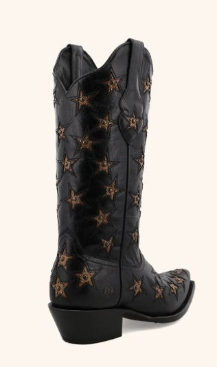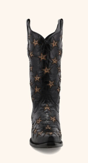 Find comfort in the stars with this Marfa boot. Dressed in a beautiful black full-grain leather and adorned with gold inlay stars and studded embellishments, you are sure to turn heads in this showstopper boot. The Marfa features a 12" shaft height, 2" western heel, and snip toe for a sleek profile design. The Marfa is just as comfortable as it is beautiful thanks to a cushioned footbed and soft leather lining.