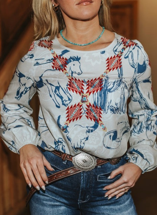 Lucky & Blessed Ivory Western Printed Long Sleeve Elastic Cuff Top T0912-BE