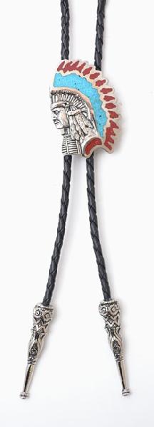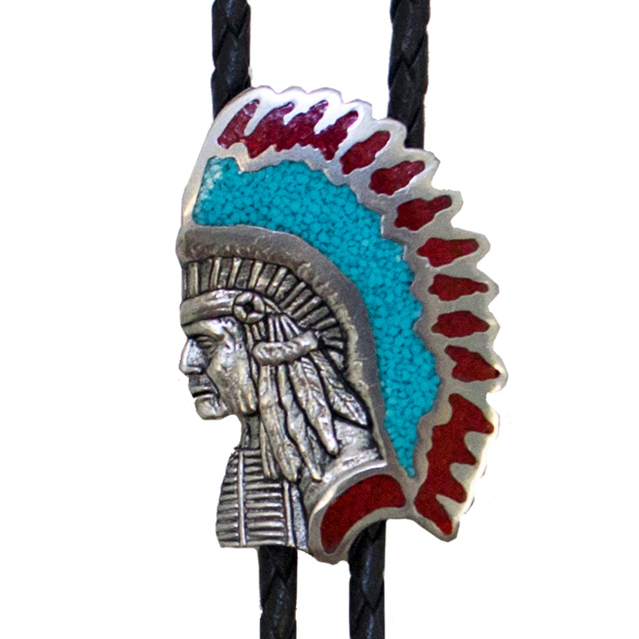 An Indian Chief design is featured on this bolo tie made of lead-free pewter featuring a head dress design made of a turquoise and coral chip inlay. Bolo tie cords are 38" long and feature finely detailed Victorian style bolo tips with a hand-carved look. Made in the USA. Measures 1.25 in x 1.875 in