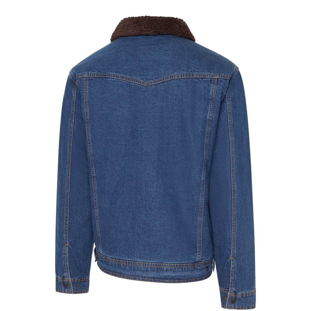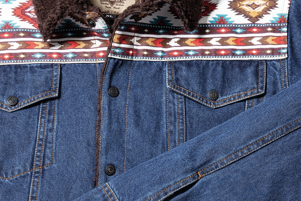 Short western denim jacket with an inner lining and collar made of warm faux sheepskin. The shoulder trim in an elegant Aztec design makes this canvas jacket a real eye-catcher. The two breast pockets, metal press studs, two slit pockets and an inside pocket make this jacket a functional piece of clothing and round off the design perfectly.