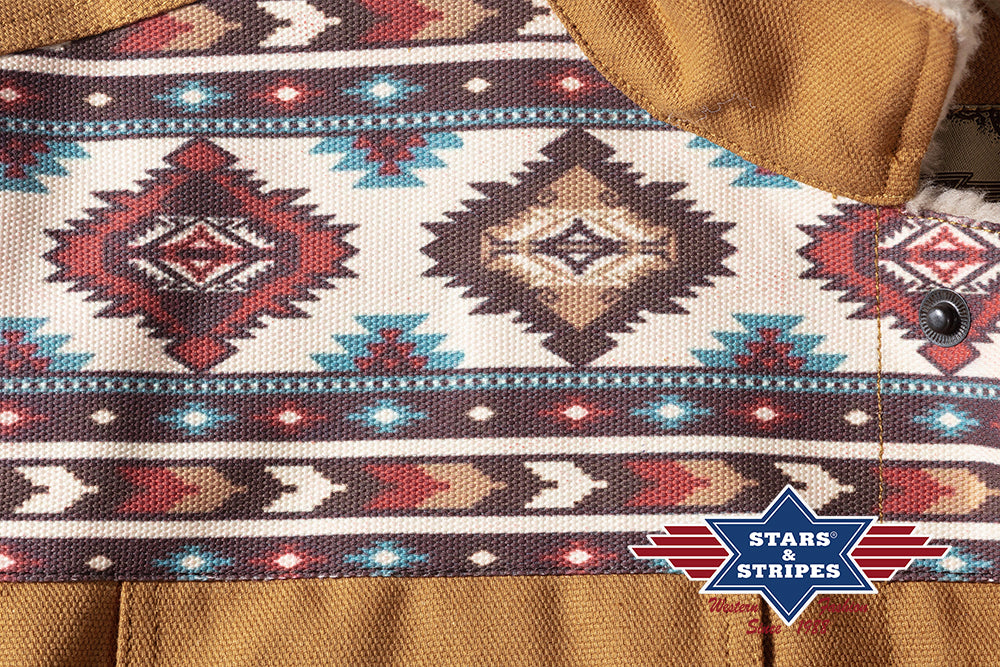 Short western canvas jacket with lining and collar made of warm imitation sheepskin. The shoulder trim in a noble Aztec design makes this canvas jacket a real eye-catcher. The two breast pockets, metal press studs and two side pockets make the jacket a functional garment and round off the design perfectly.