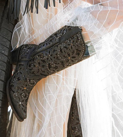 This black-on-black 13-inch shaft height of beautiful floral designs and the perfect amount of glitz is just what you need to complement that dress, shorts, or jeans.