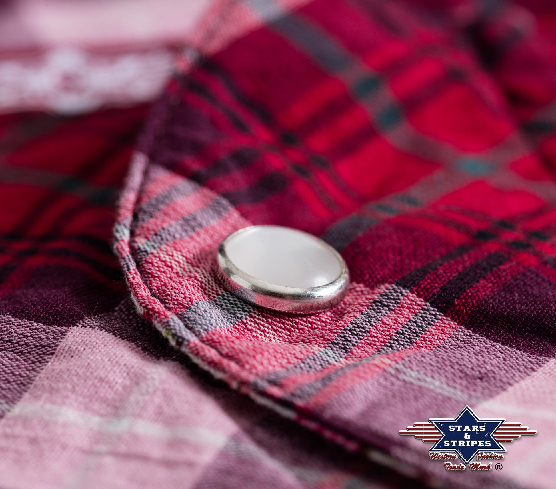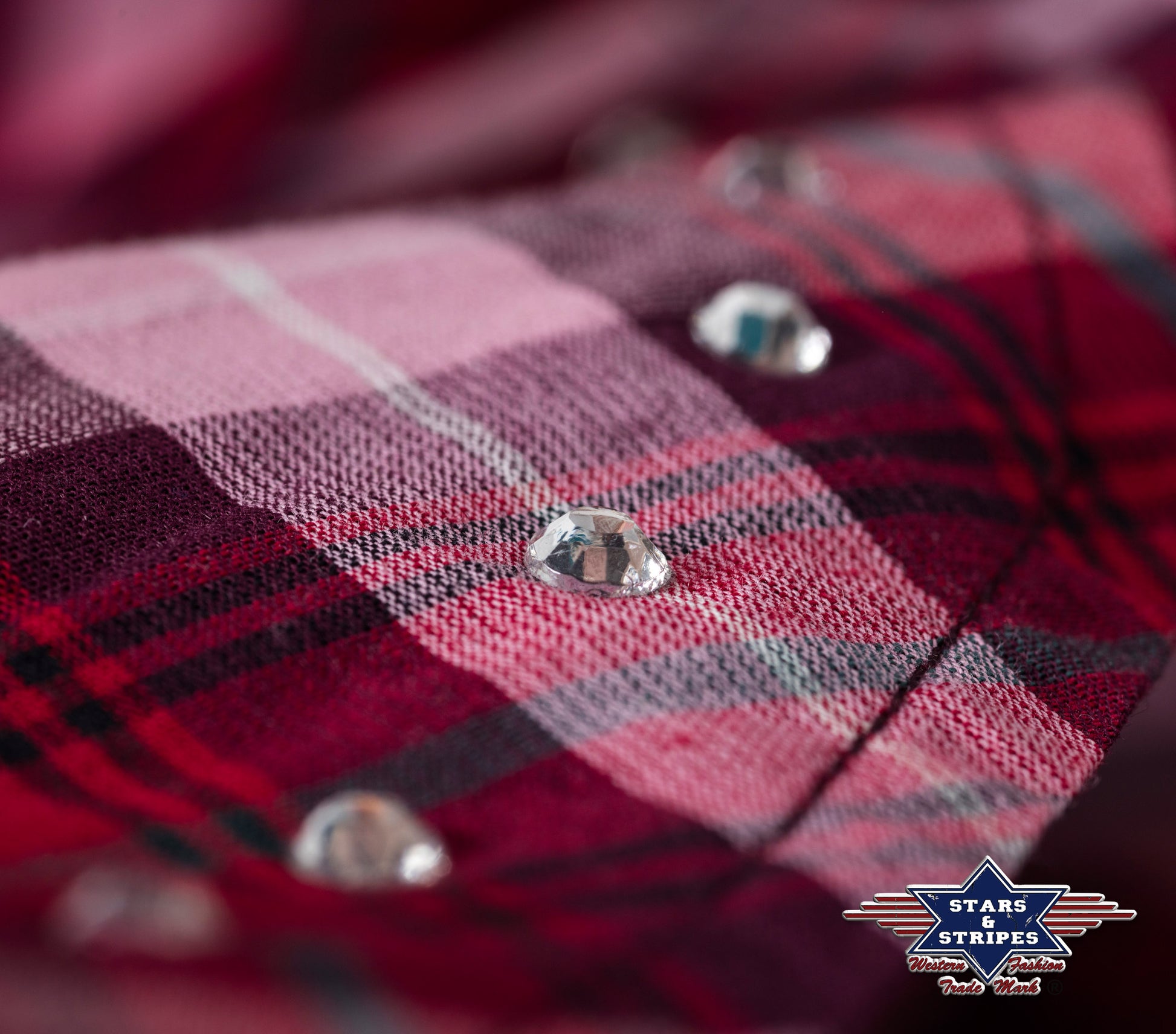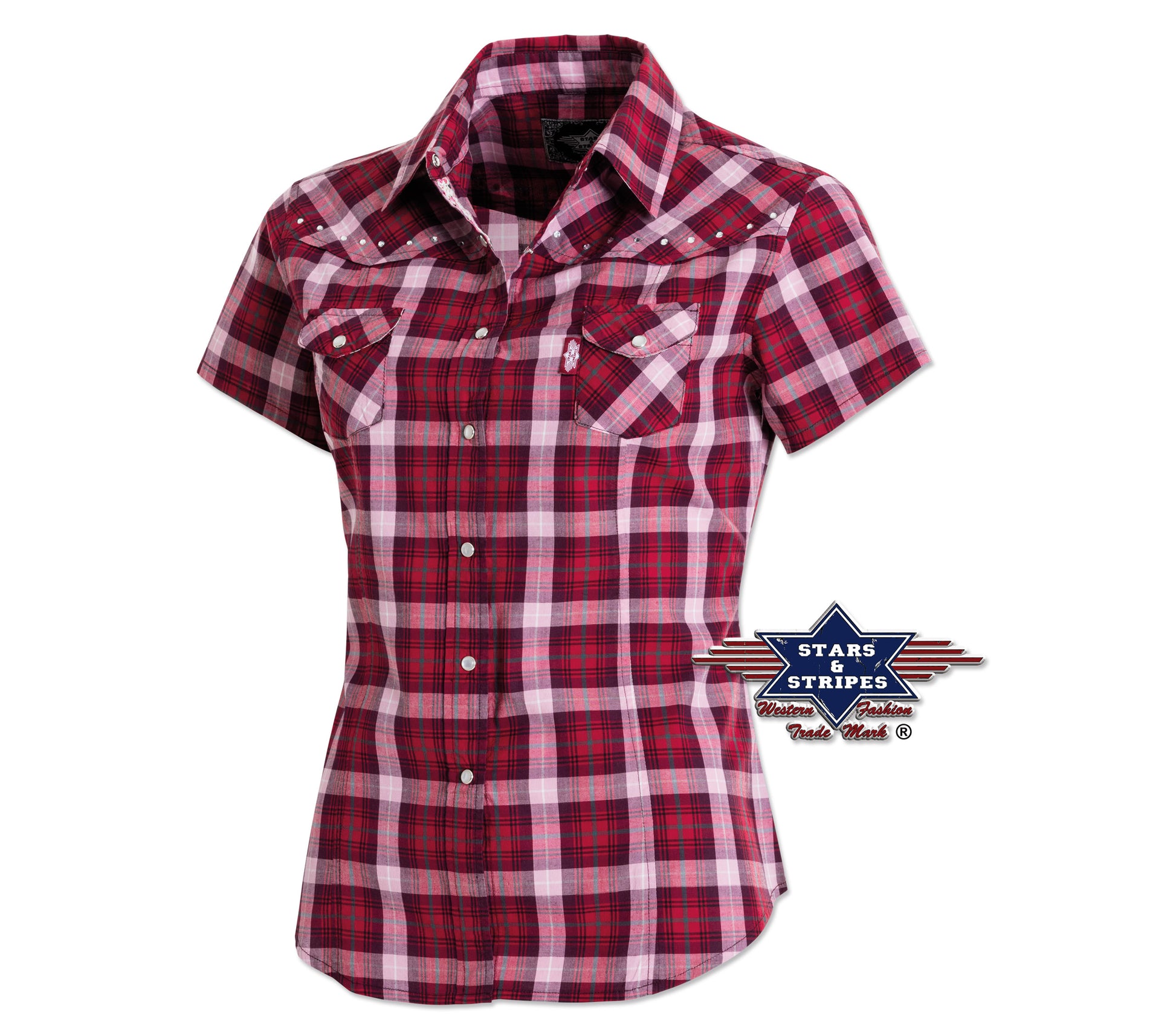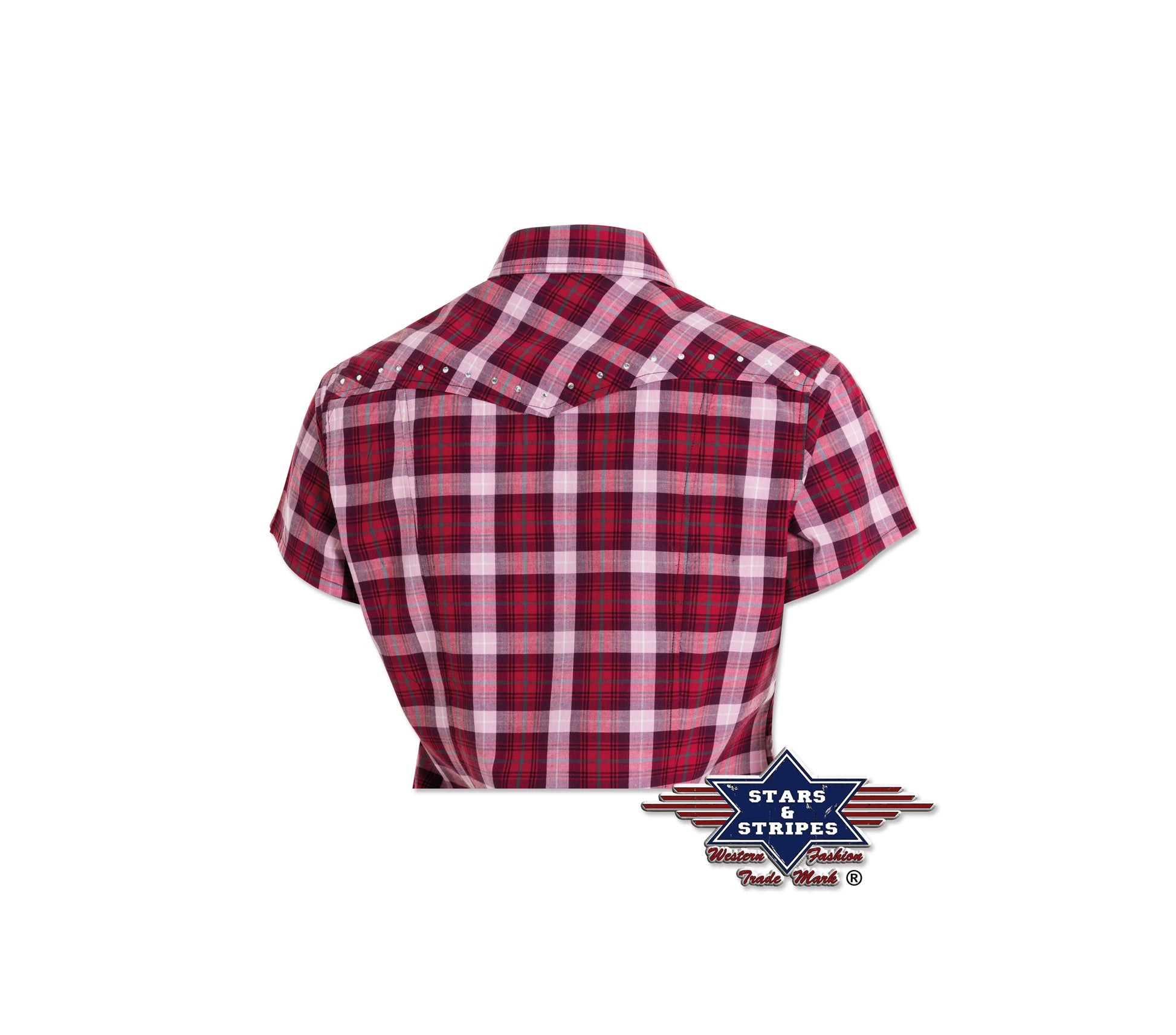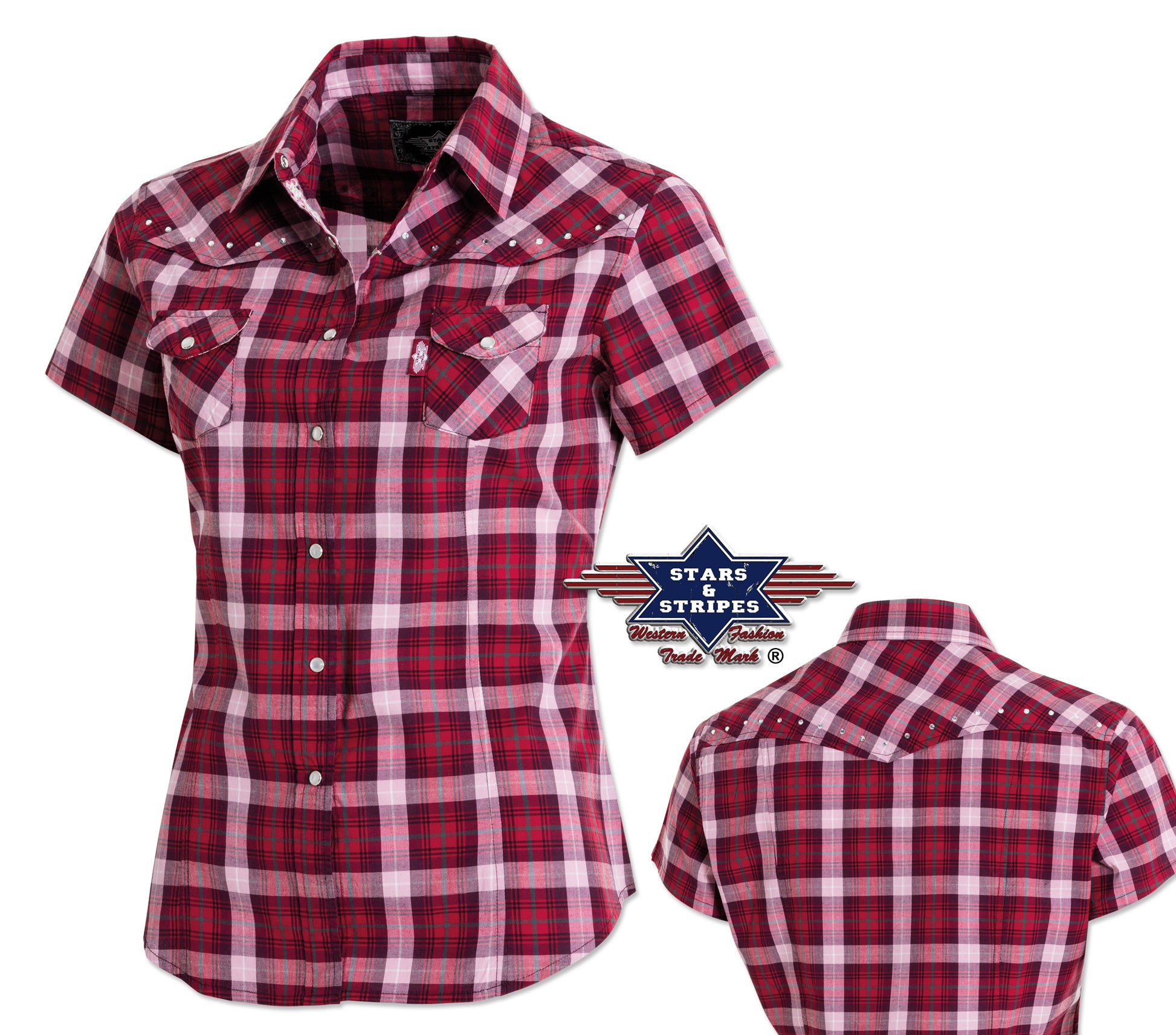 Light short-sleeved blouse with rhinestones on the chest and back. Special emphasis is put on the trim of little flowers on the button strip and pocket flap. with nacre press studs.
