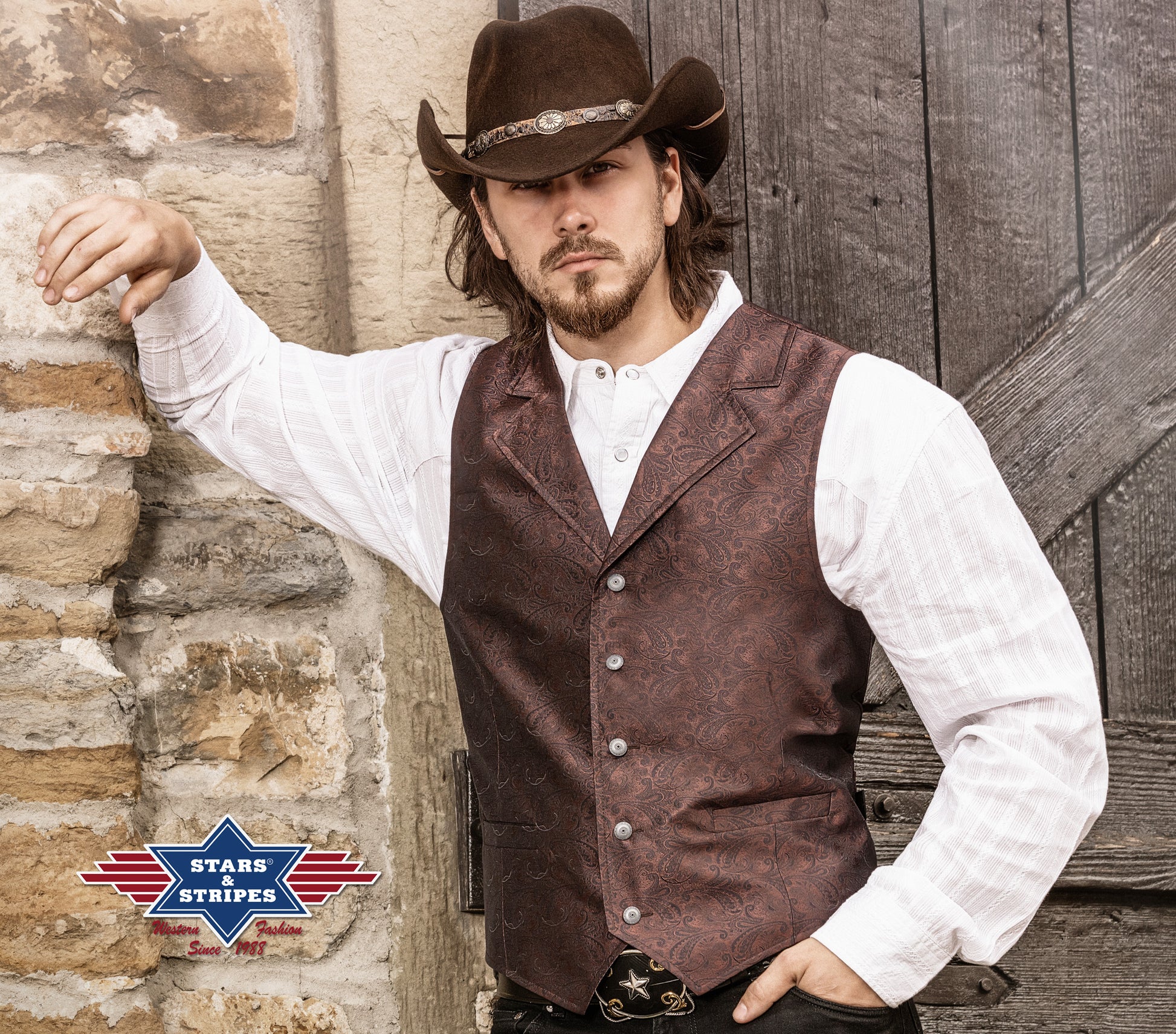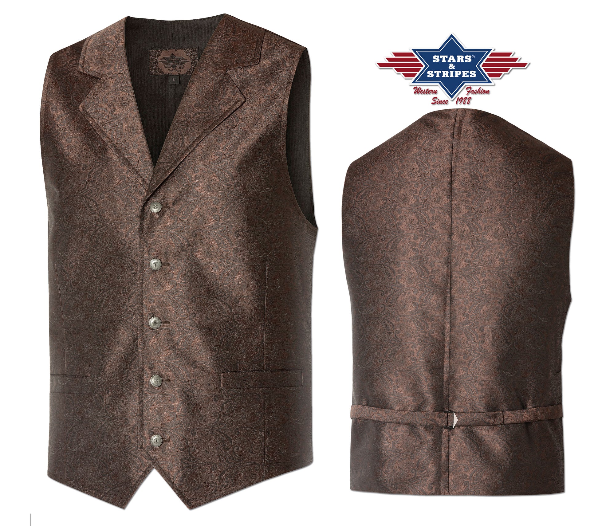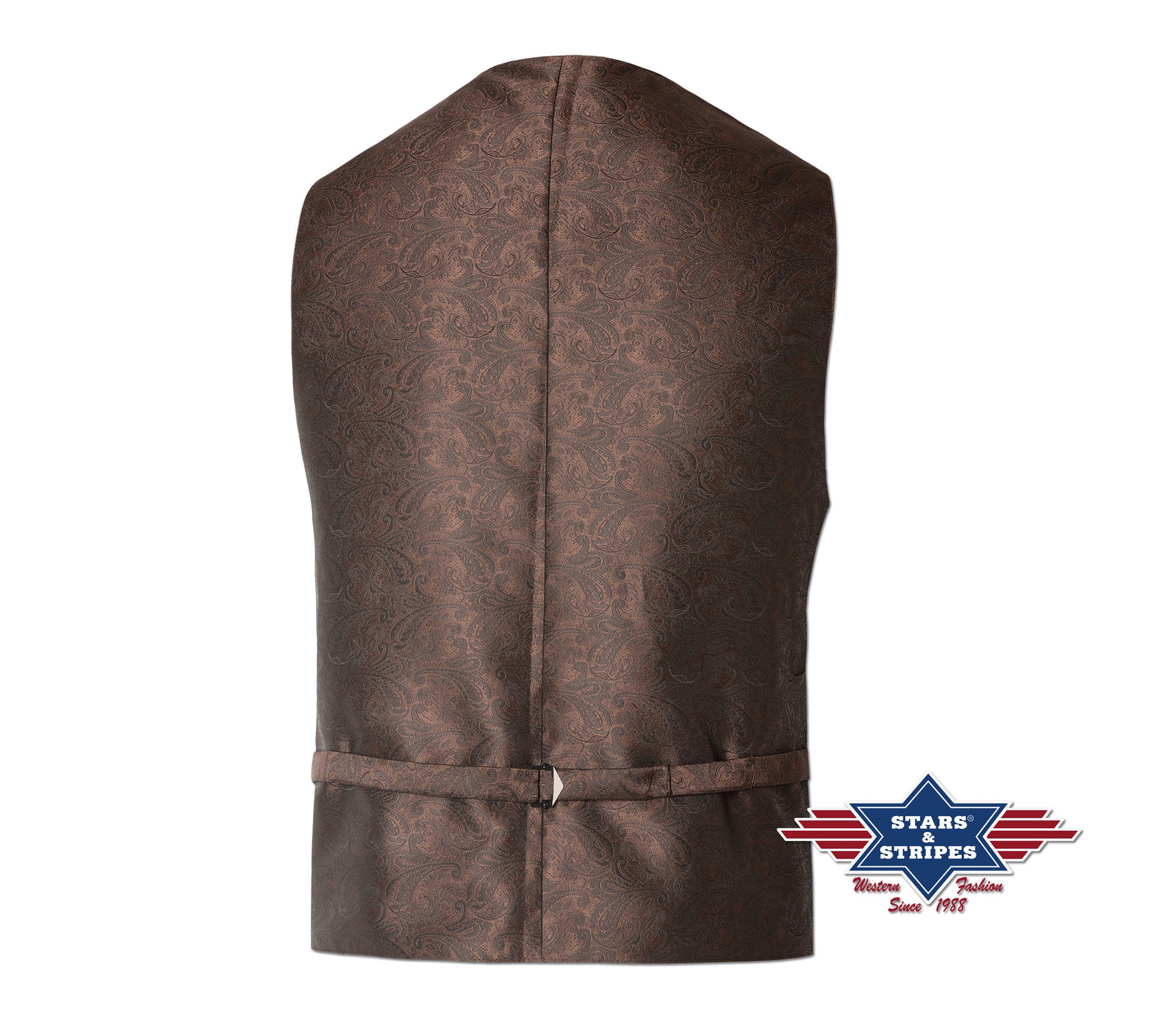 Jacquard western waistcoat with two side pockets and decorative metal button. Can be adjusted by a strap on the back.