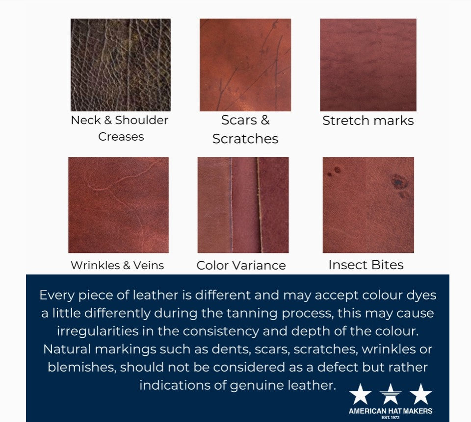 Due to the all natural leather and finishing used in the making of this hat the colour may vary to the stock photos.