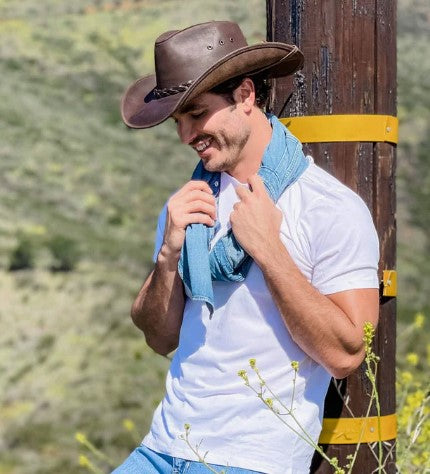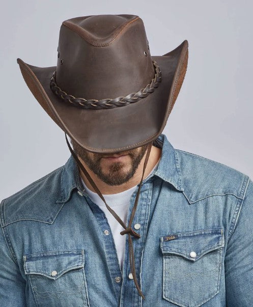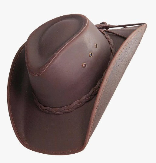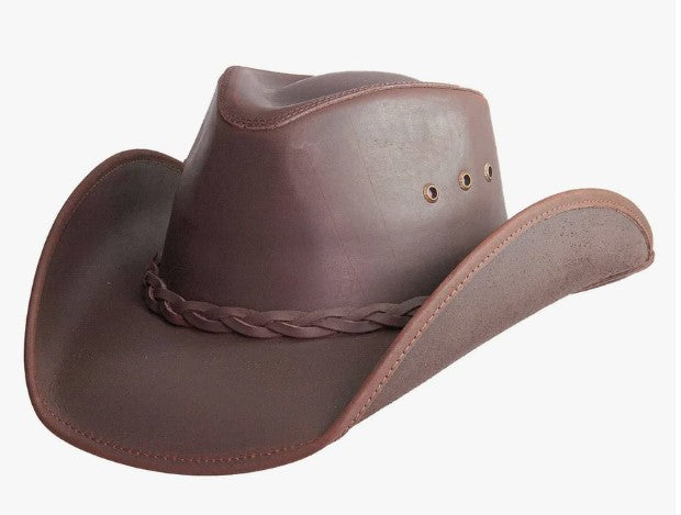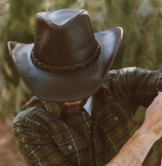 This unisex leather cowboy hat is the perfect pairing of form and function. Built using durable, finished, 100% leather, it's built to last and protect you from the sun and rain on any adventure. Yet with its curved brim, and all-leather braided band, it's one of our best-looking hats.