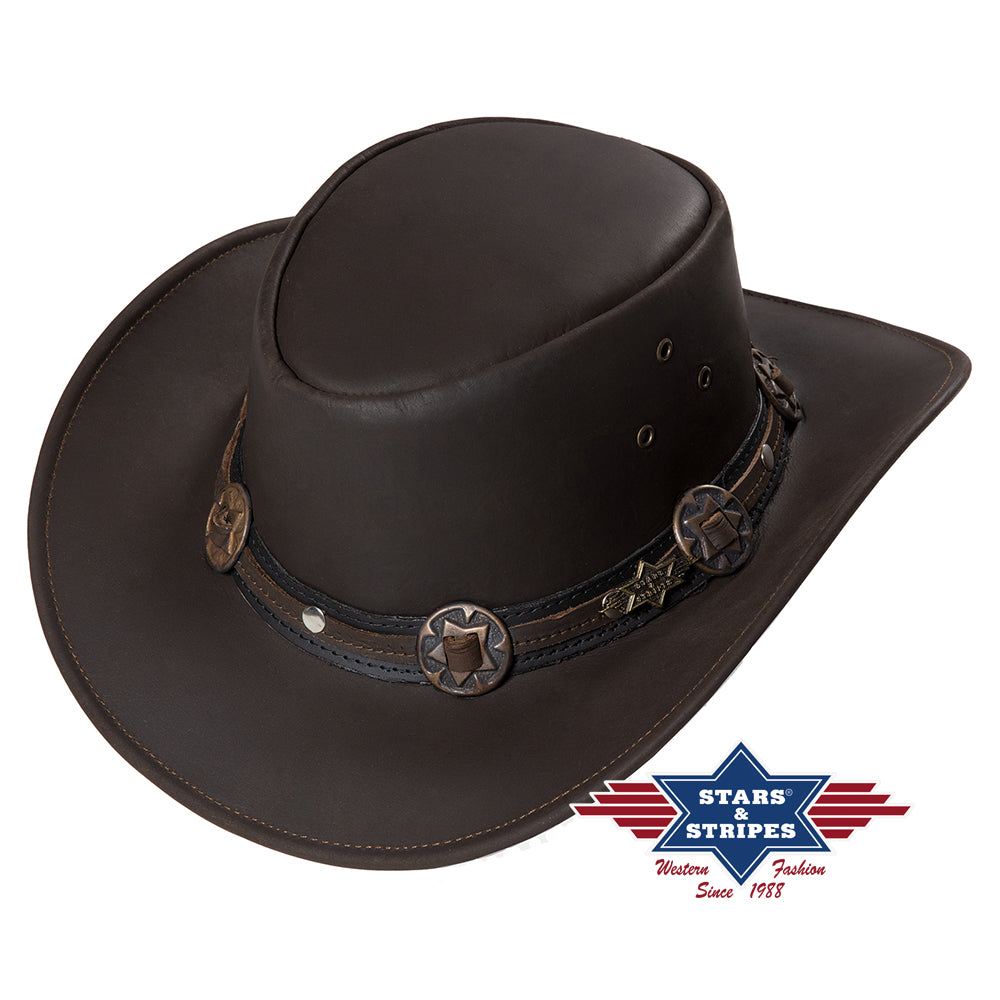 Cool western hat in dark brown cowhide. The hat band consists of two leather straps, which are studded with conchos and rivets. Pleasant wearing comfort due to a soft inner band. With adjustable tie made of leather.