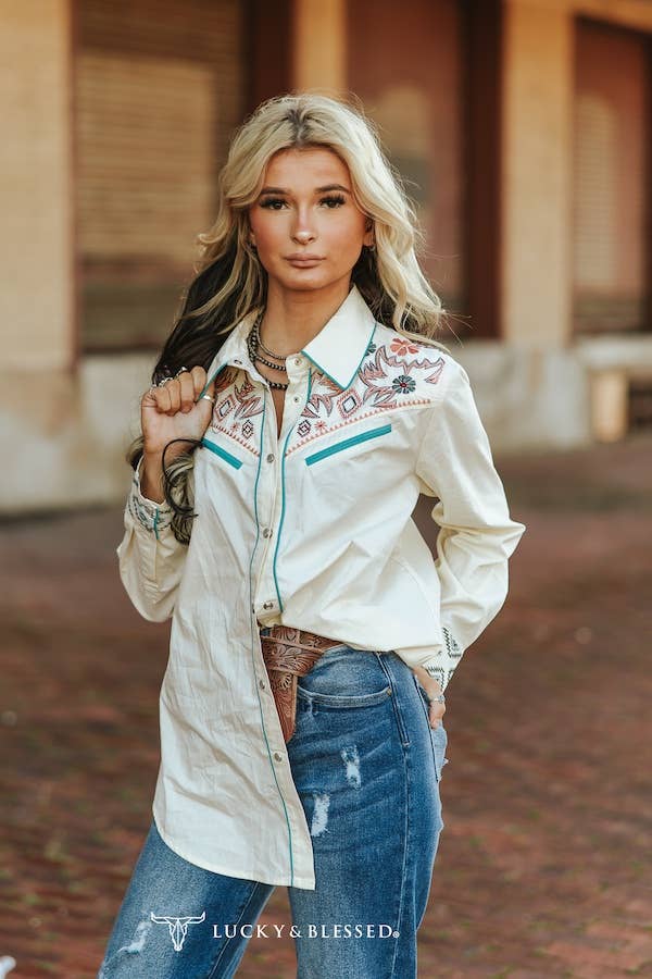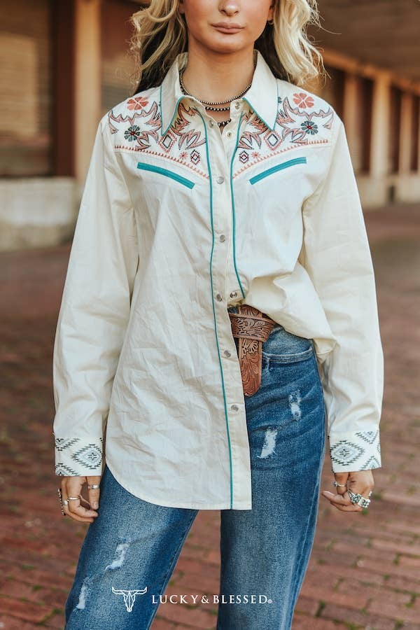 Lucky & Blessed Ivory Aztec Embroidered Western Yoke Pearl Snap Top TO865-IVY