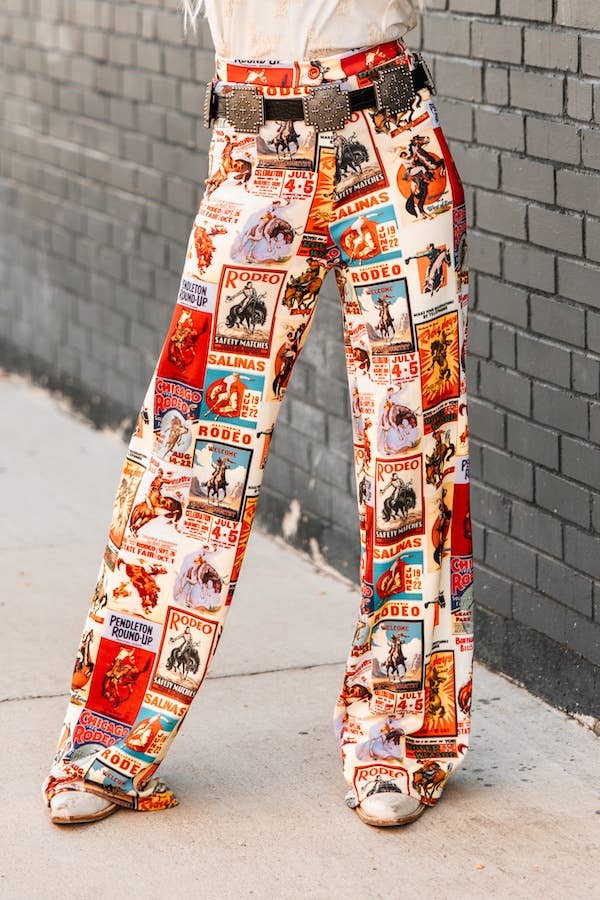 Printed high-rise full-length pants with front zipper. It can be accommodated with your favorite tops. nfr western rodeo