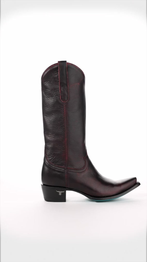 It's giving western. Timeless snip toe and classic cowgirl silhouette. Meet Emma Jane in Black Cherry.