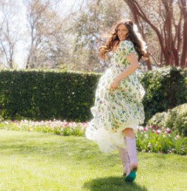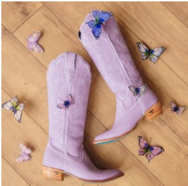 The boot features lovely lavender leather, scalloping, delicate butterfly stitching, and a whimsical, floral-inspired edging, and the Lane signature blue bottom.
