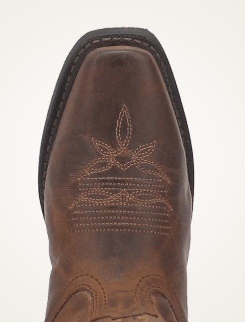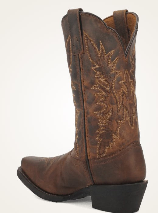 The Malinda boot delivers western style with a touch of modern flair. This beautifully distressed all-leather boot is designed with traditional stitching on the shaft. Comes with a Removable Orthotic, cowboy square toe, and a Flight Rubber outsole for added comfort.