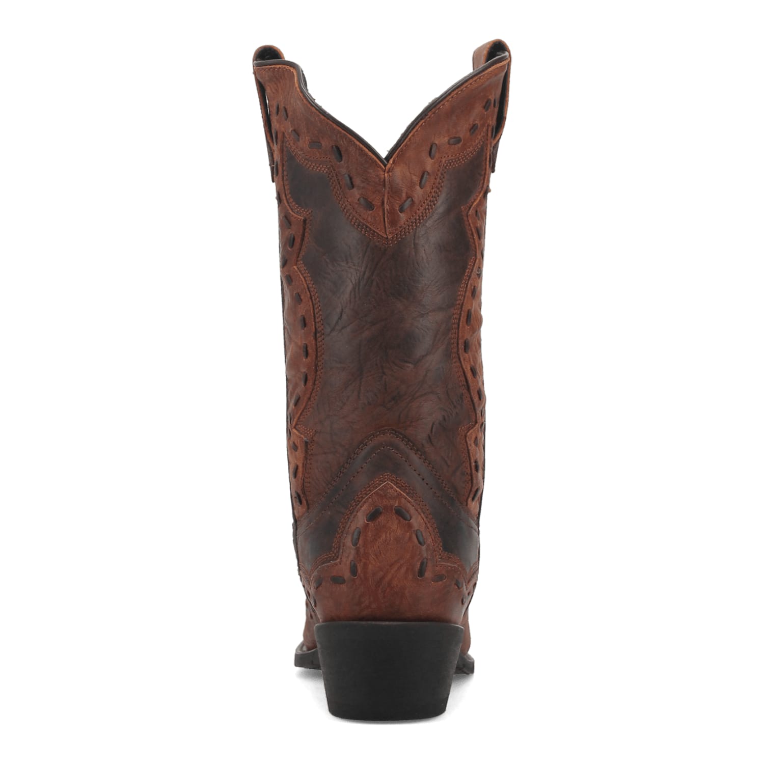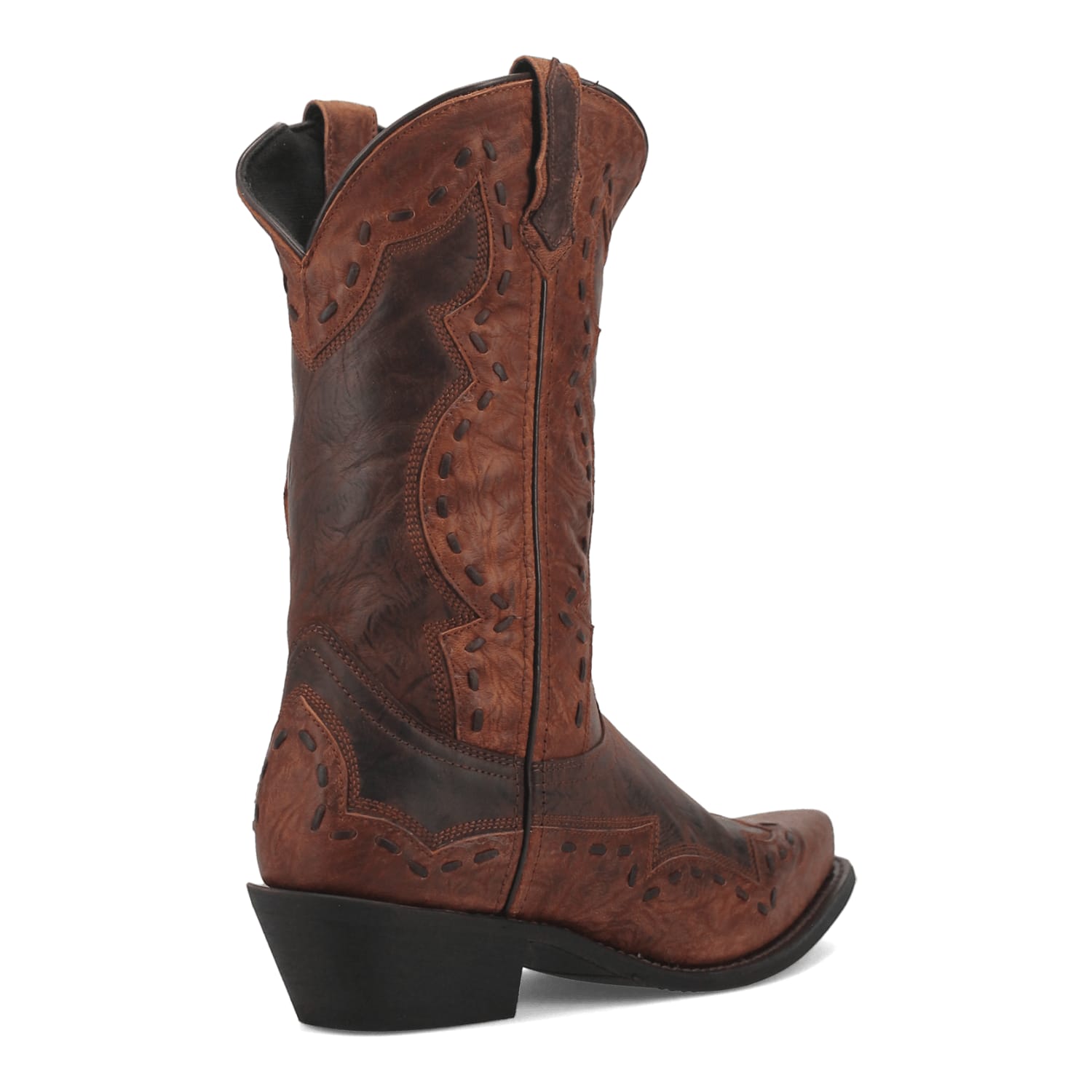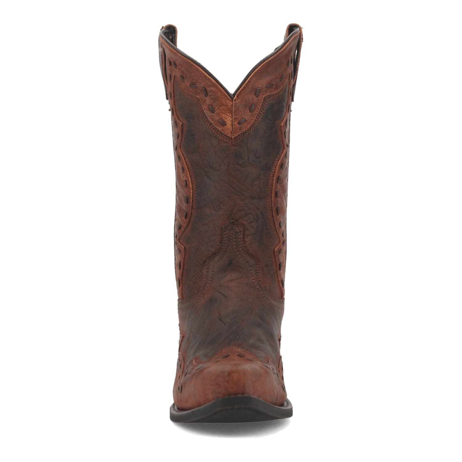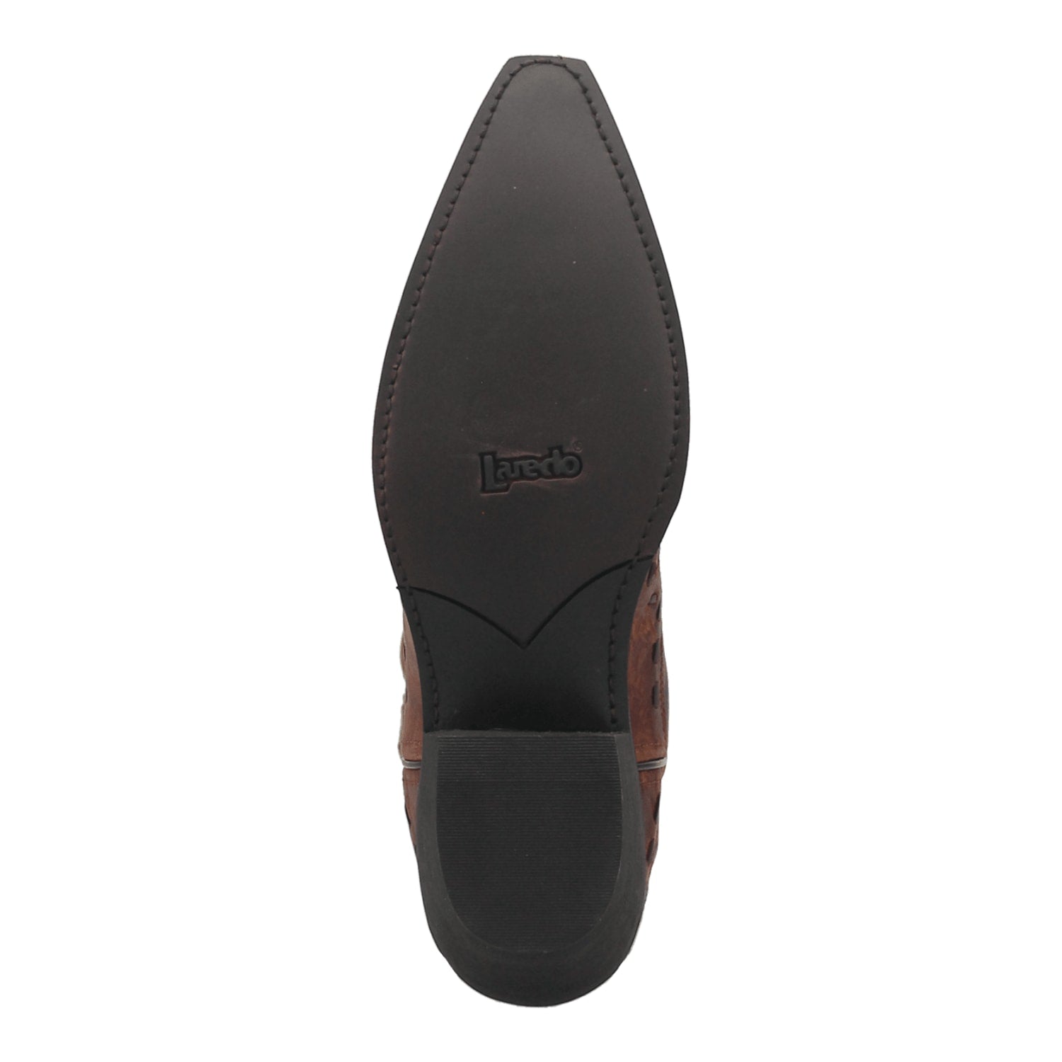 If you like your boots a little fancy, the Laredo Ronnie is your new boot The unique design features contrasting wingtip, side and collar overlay accented with laced stitches Highlighted by fashion snip toe, cowboy heel and lightweight rubber outsole