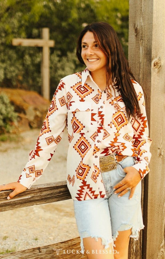 Lucky & Blessed Cream Aztec Button Down Long Sleeve Top TO066-BRAZT