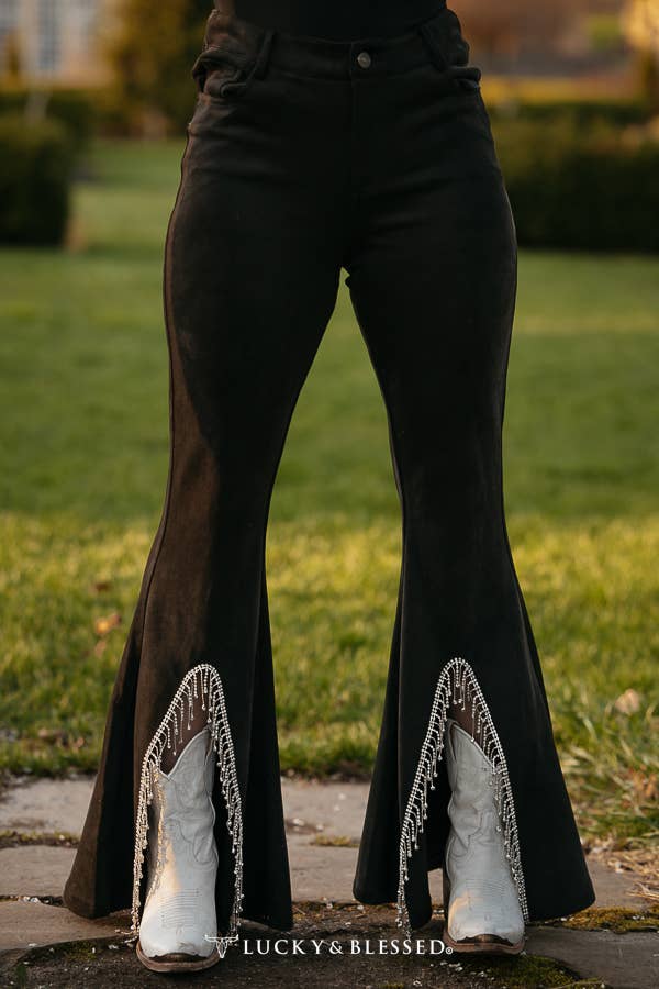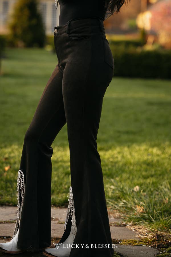 Lucky & Blessed JE-179-BK Plus Size Black Suede Flare Jeans W Rhinestone Hem Slit