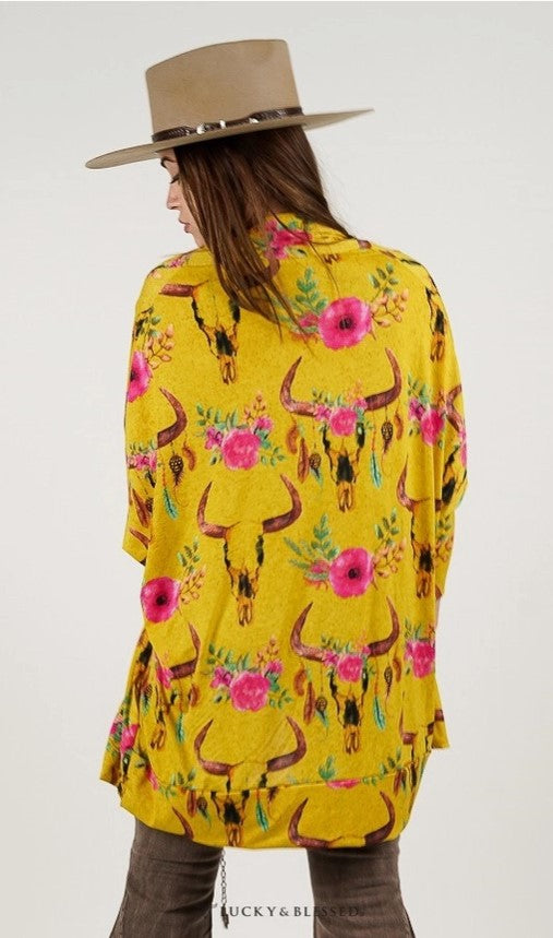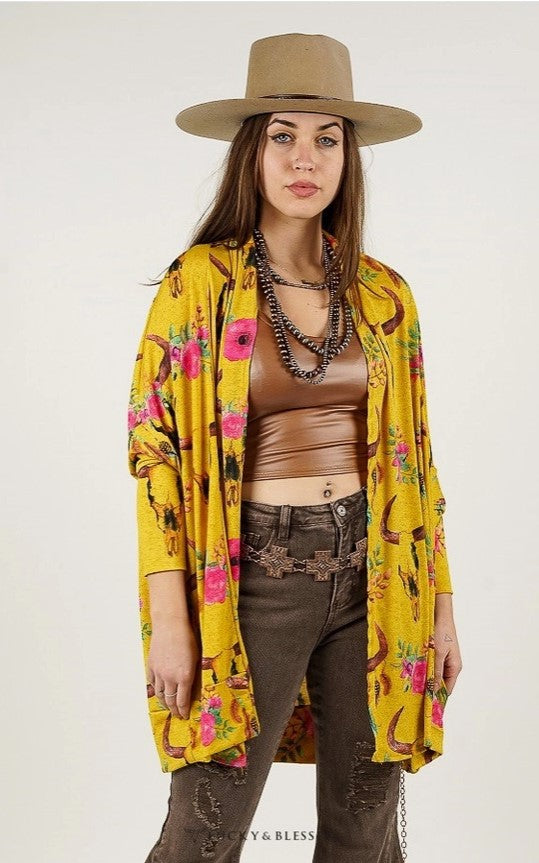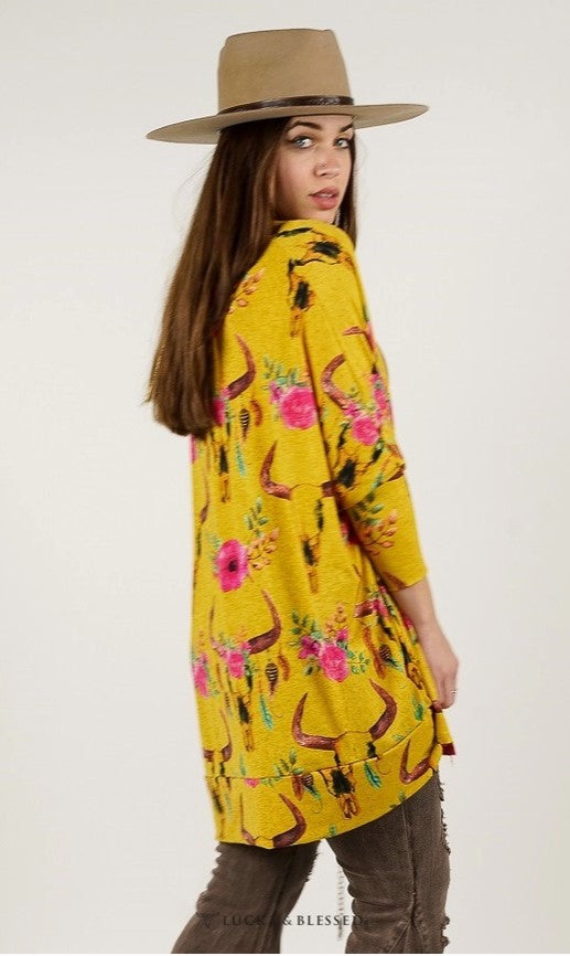 Lucky & Blessed Mustard Cowskull Dolman Sleeve Sweater Cardigan LBLT-PSWR5-CS