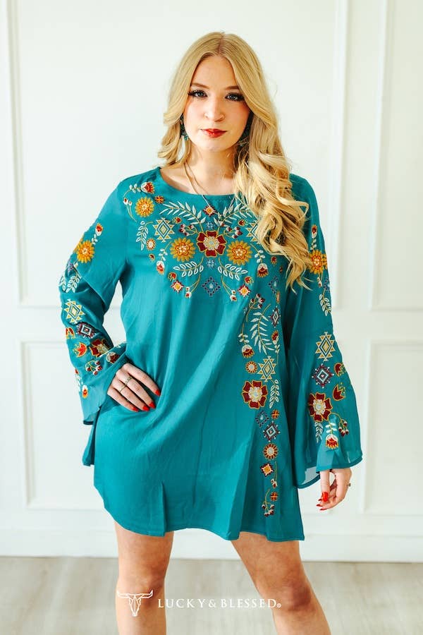 Lucky & Blessed Teal Bell Sleeve Floral Embroidered Blouse TO562-TL