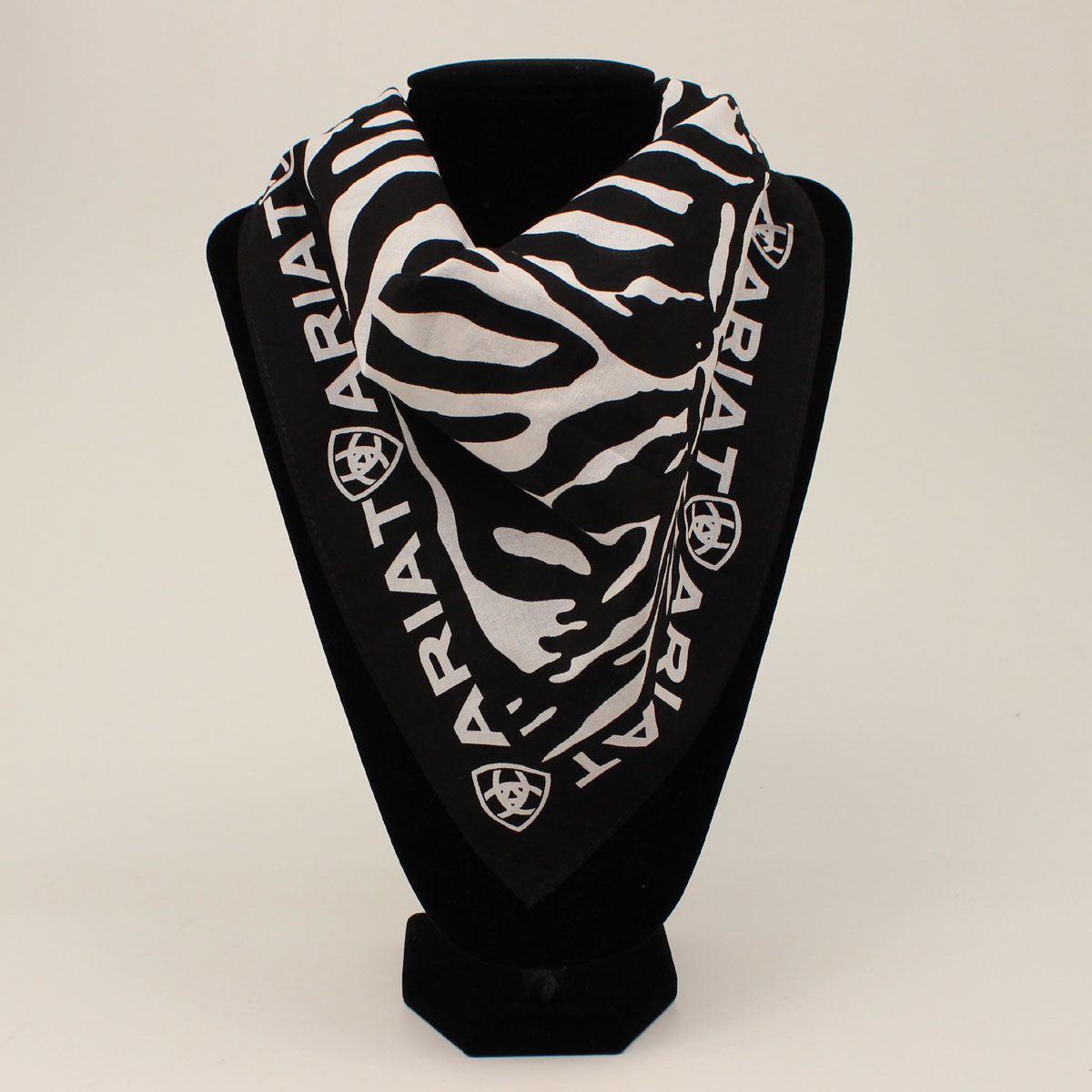 Soft and comfortable Ariat bandana by M&F Western Products. Lightweight and breathable 100% cotton in a zebra pattern. Ariat wording and shield logo around the edges.