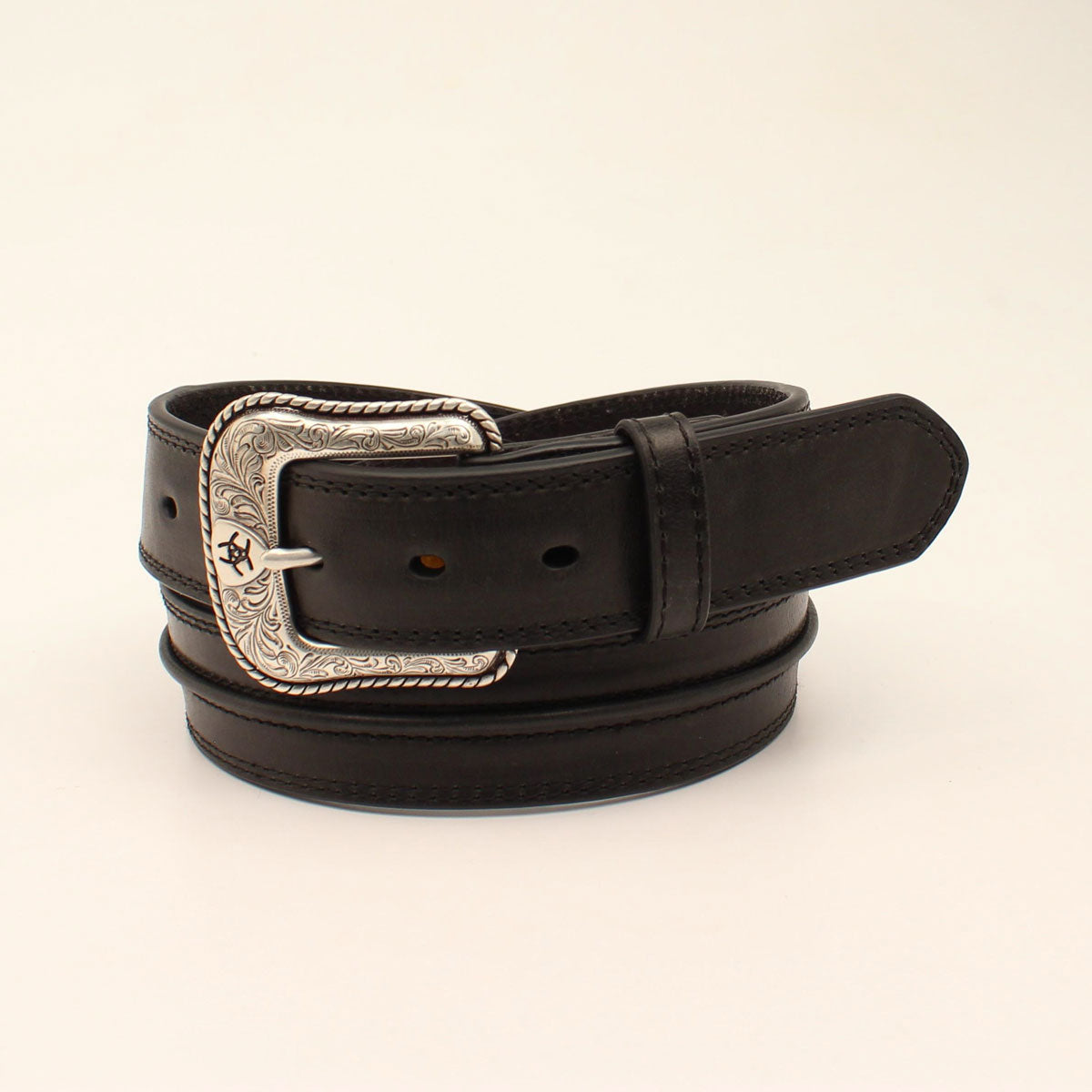 This stylish Ariat belt by M&F Western Products® features a sturdy leather strap with a raised leather strip down the length of the belt. An Ariat shield logo is stamped into the end tab and it's finished off with a detailed silver buckle with an Ariat Shield logo etched into it.