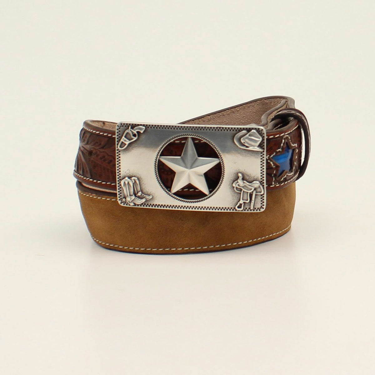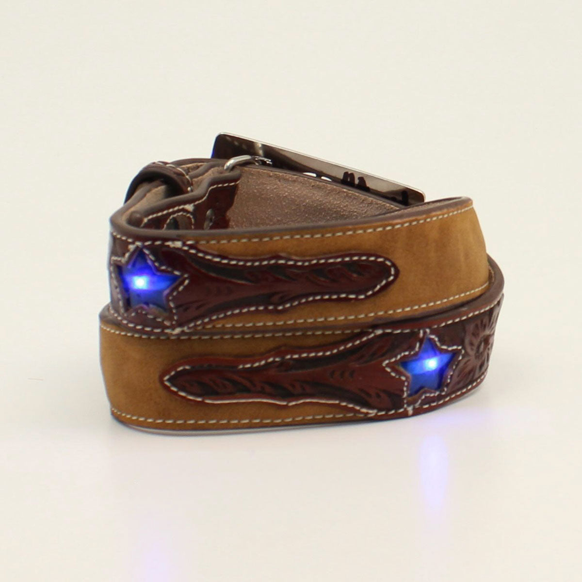 3D belt by M&F Western Products has a brown strap with light up blue stars inlayed on the tabs. Square buckle with western motifs.