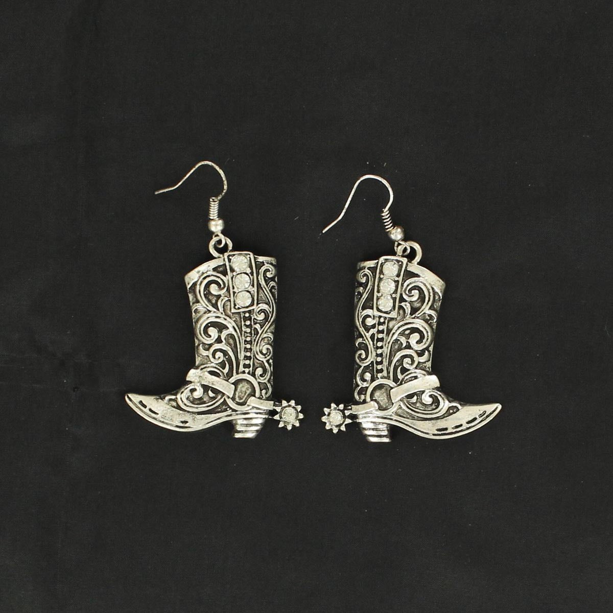 Beautiful earrings by M & F Western Products are perfect for the fashionable cowgirl. Boot shaped, silver toned, and accented with rhinestones. French hook.
