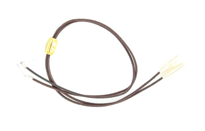 Attaches with a cotter pin that goes through the sweat band stitching and opens to secure it to the hat.