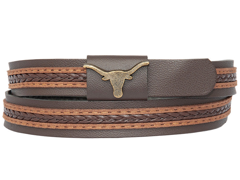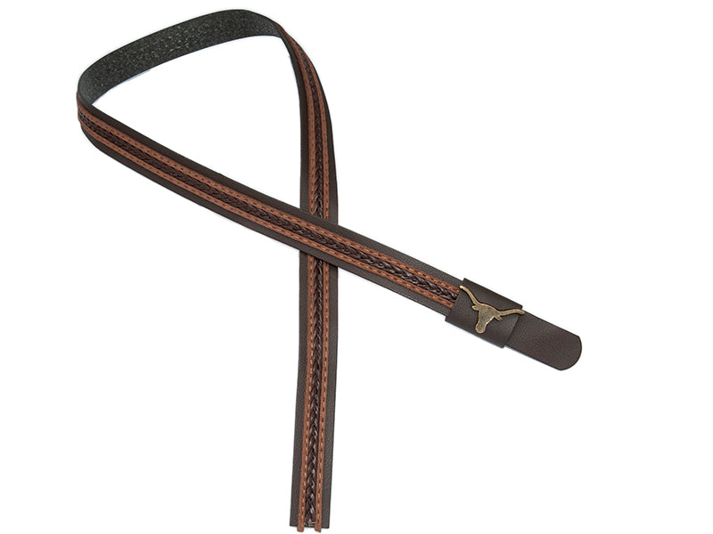This two-tone brown leather hatband with a woven center and bronze-tone metal steer head is a must-have for cowboys and cowgirls alike looking to elevate their style.