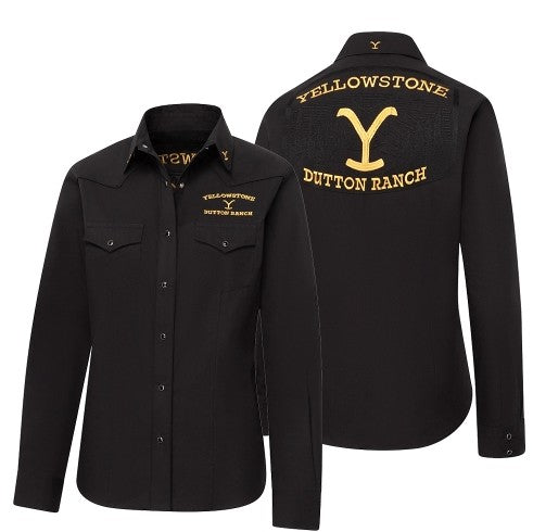 Exquisite Yellowstone Western blouse with two-tone premium embroidery on the back. The Western yoke is accentuated with piping. Patch chest pockets with snap buttons reflect the classic workwear cowboy style. Above the chest pockets, as well as on the collar tips and at the back of the neck, the official Yellowstone logo and the iconic Yellowstone Y are embroidered. The blouse combines an easy-care fabric structure with a tailored fit, making it a real eye-catcher ? not just for fans of the Dutton Ranch.