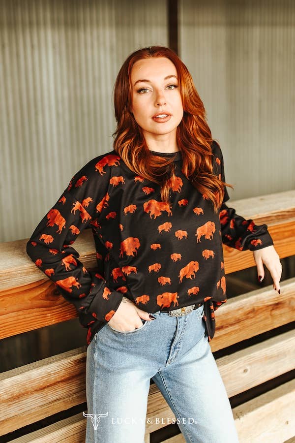 Lucky & Blessed Plus Size Black Buffalo Printed French Terry Top J0287