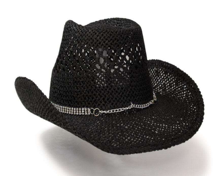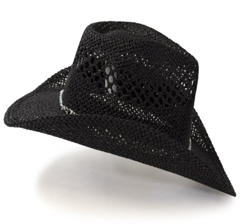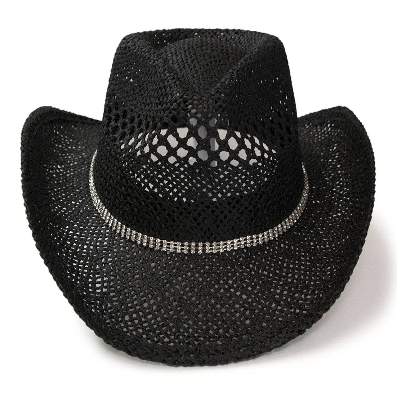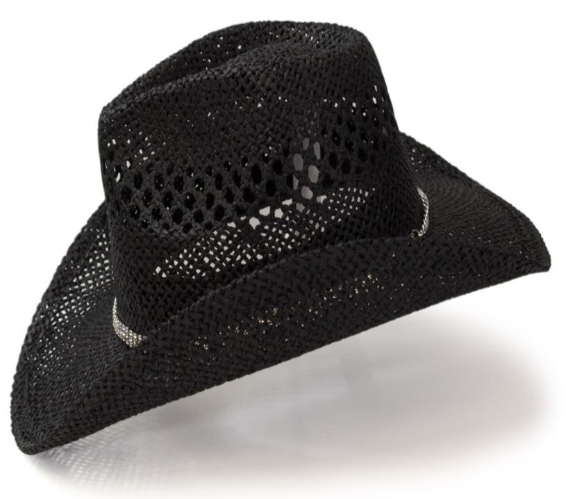 RA-311BLK Hat in Black Twisted Straw Western Pinch Front Hat with Rhinestone Hat Band