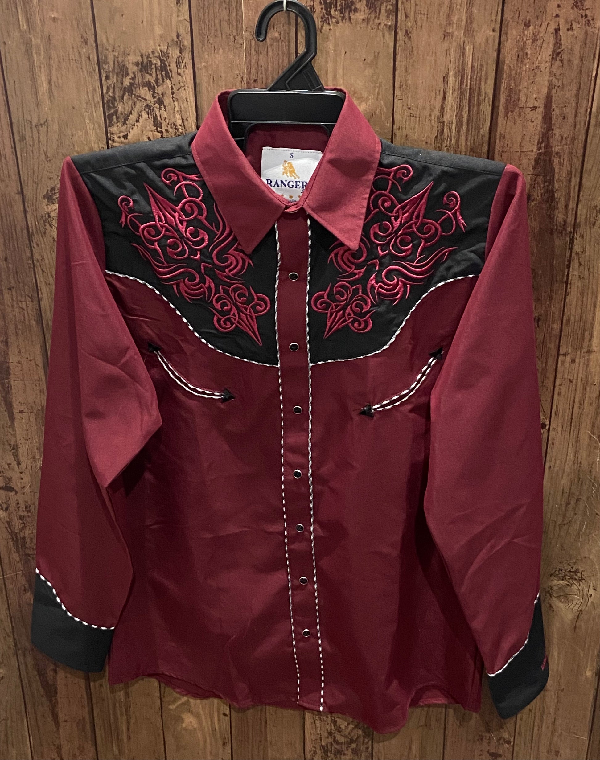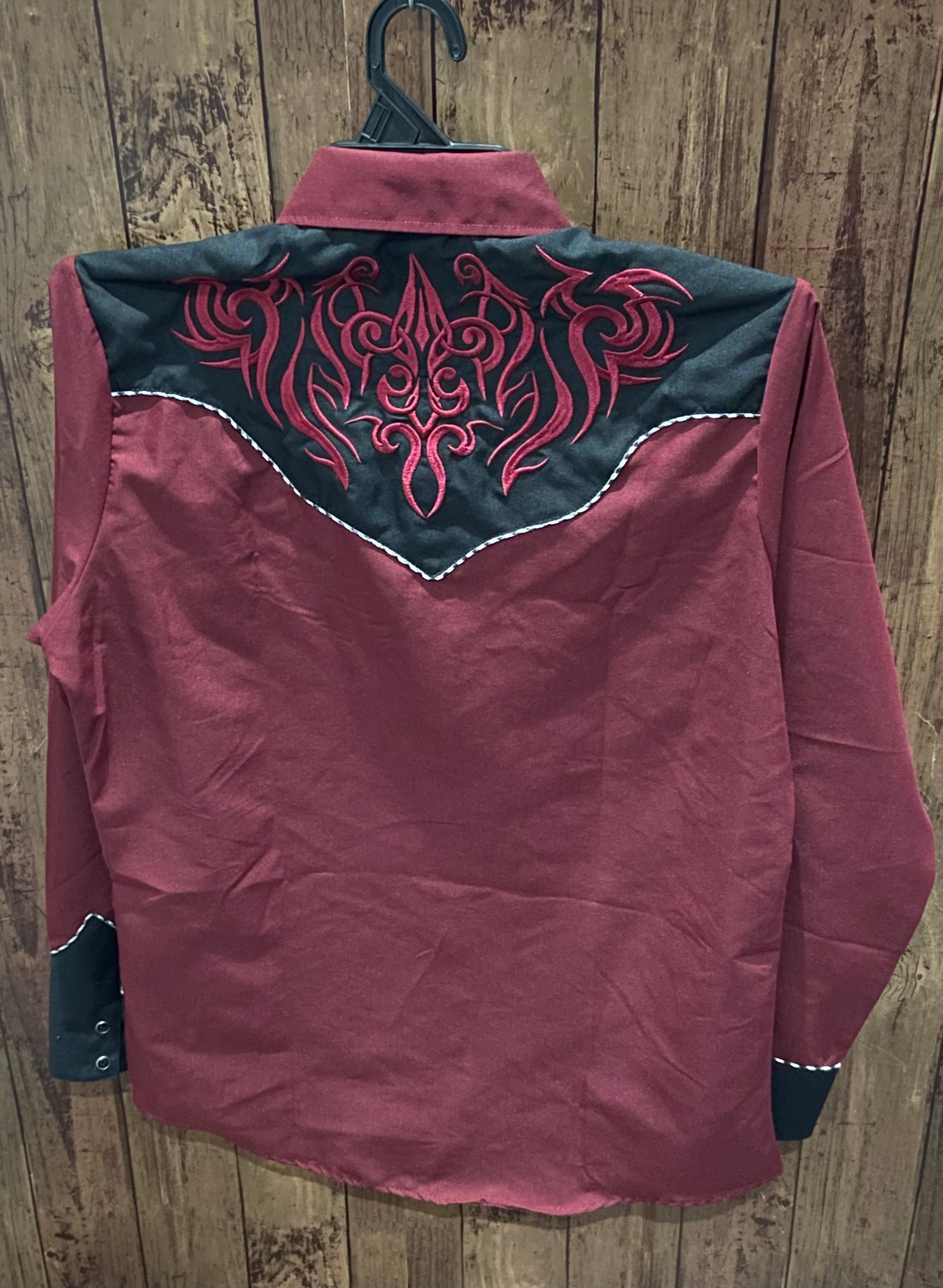 Burgundy western shirt with an embroidered design on the front and back with contrasting Black yolk
