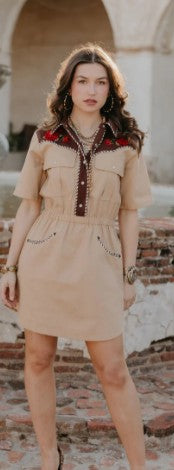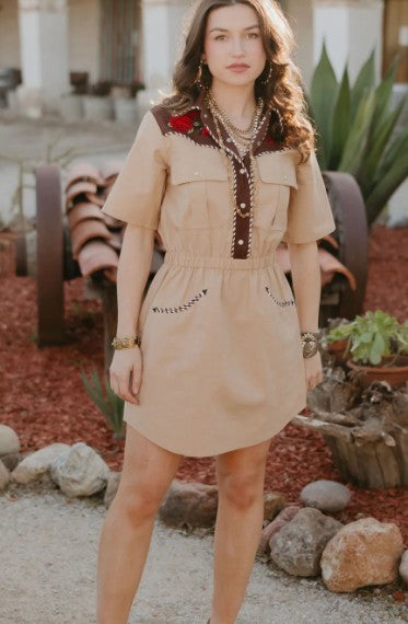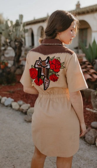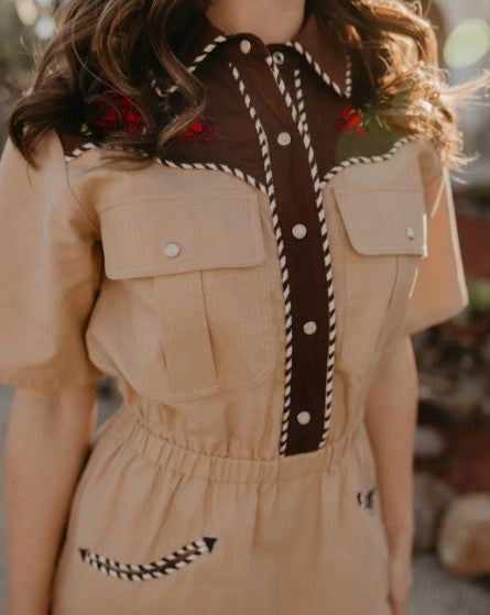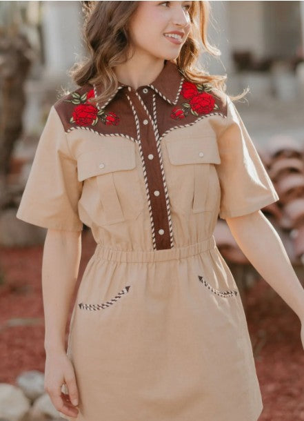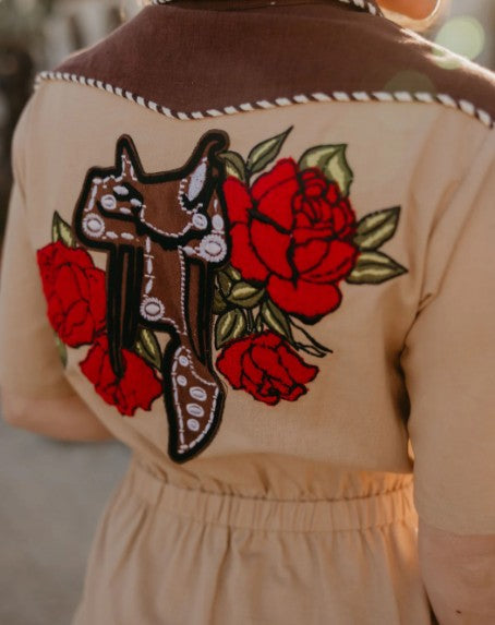 The Rosa Vaquera Button Up is denim with a romantic streak—vintage rose prints bloom on the cuffs and shoulders, while an arrow pocket and pearl snap buttons bring that western edge. It’s soft, strong, and made to stand out. Cowgirl classic, Rodeo Quincy style.