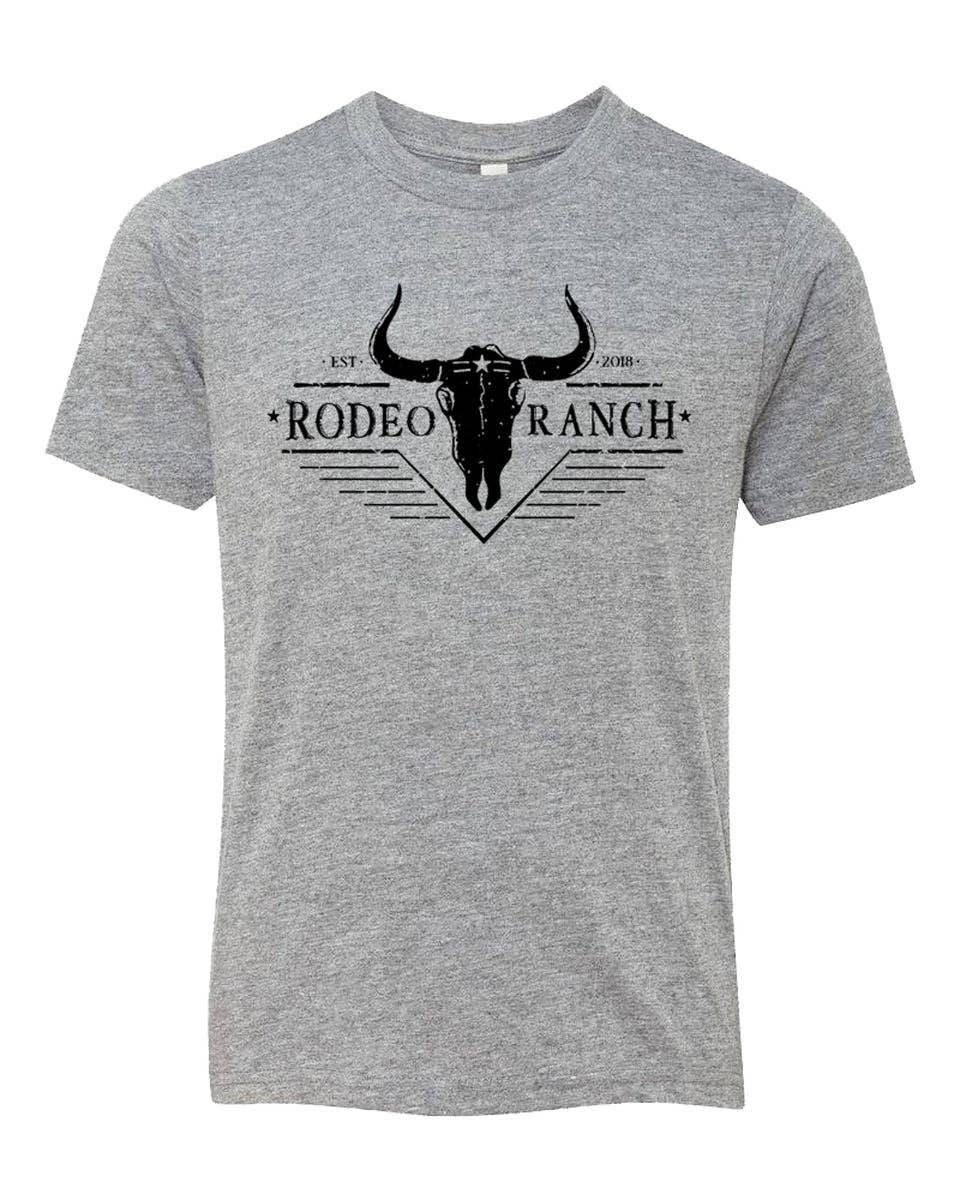 The Kids Western Short Sleeve Shirt by Rodeo Ranch features a unisex fit body in heather grey with black screen printed art.