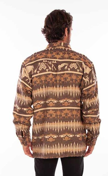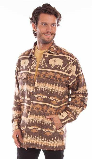It features a button front closure, point collar, two chest flap pockets with button closures and two lower open diagonal side entry pockets.