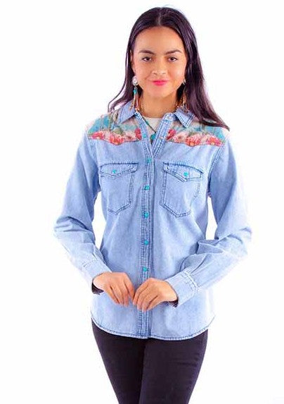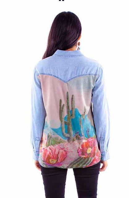 This denim shirt stands out from the rest with a microfiber cactus scene on the back and front yokes.