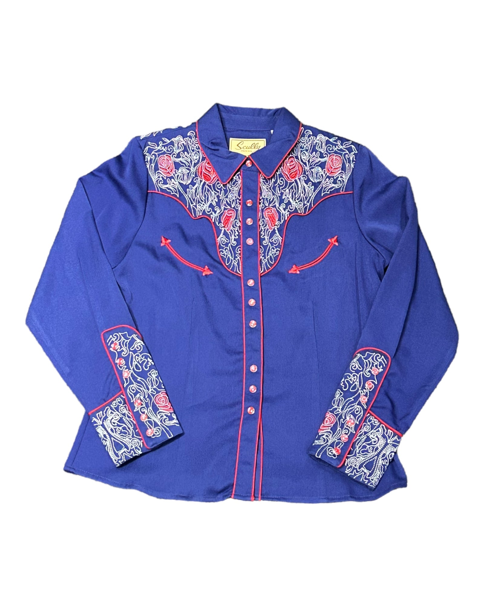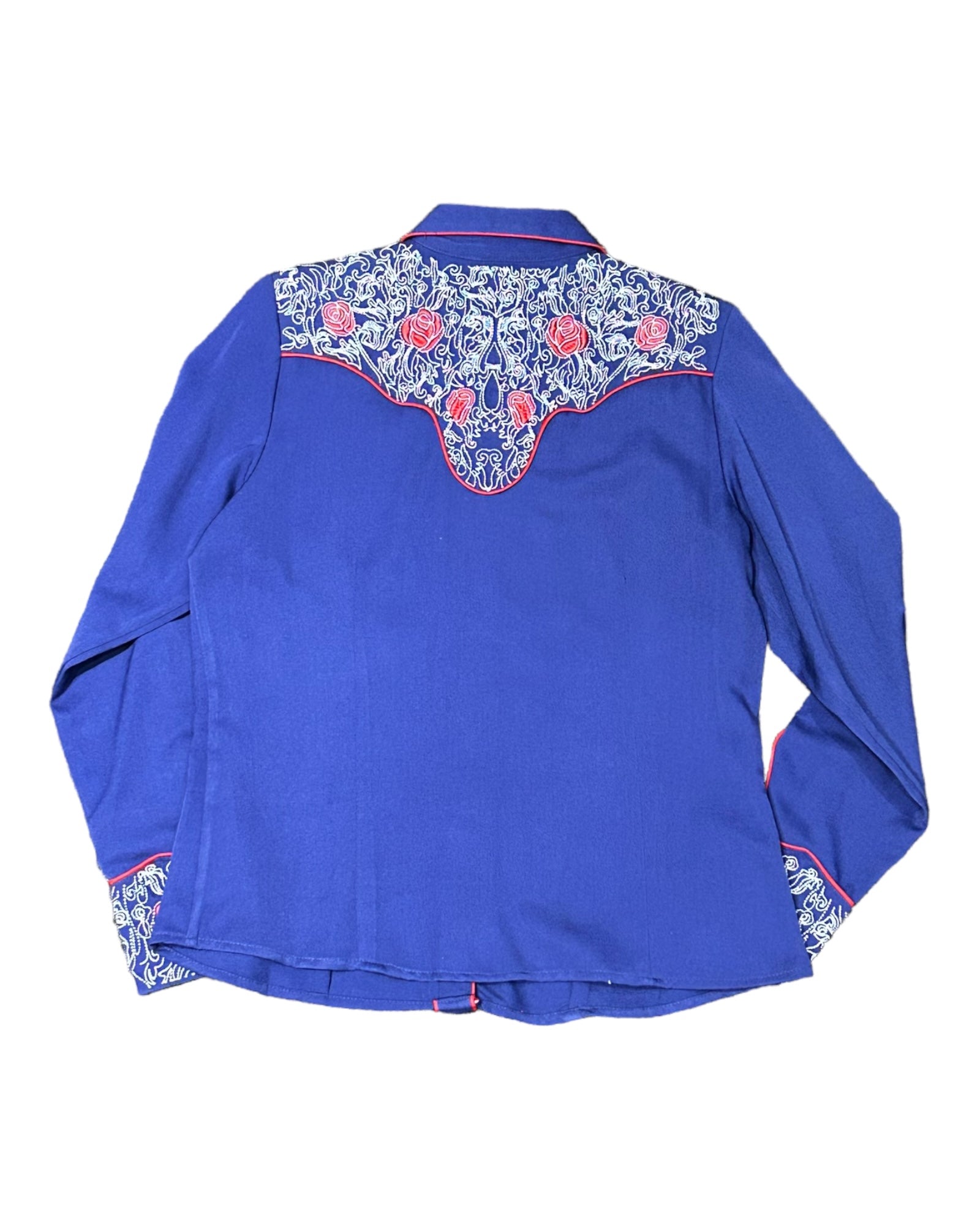 Poly/rayon blend shirt has a snap front and cuff closures. The mesmerising embroidery has red roses interspersed with an elaborate pick stitch on front and back yokes. Piping throughout with two front smile pockets. Machine wash cold and hang dry