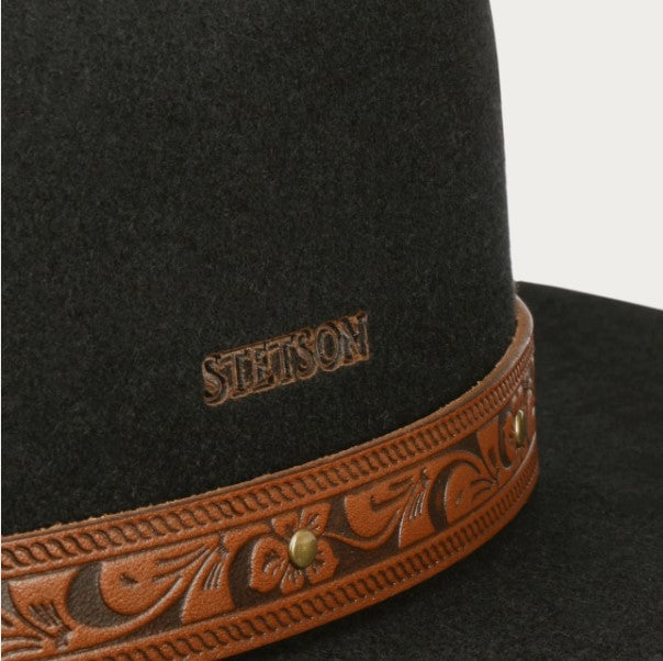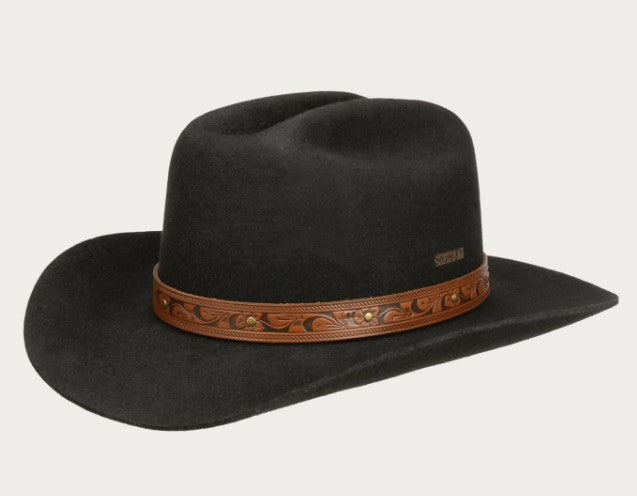 Wool forms the foundation of Stetson´s Western hat, a striking design with a skilfully dented crown and a sweeping brim. The reinforced warm, smooth felt ensures the hat retains its shape, while the solid-colour look is completed with rustic embossed leather trim and branded detailing. The addition of a COOLMAX® sweatband for breathable, moisture-wicking, and comfortable wear makes it a characterful addition to any outfit.