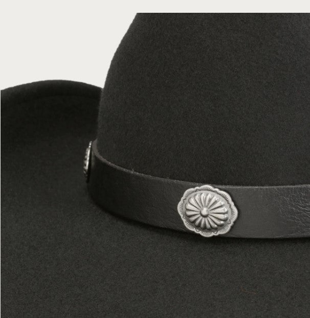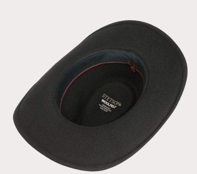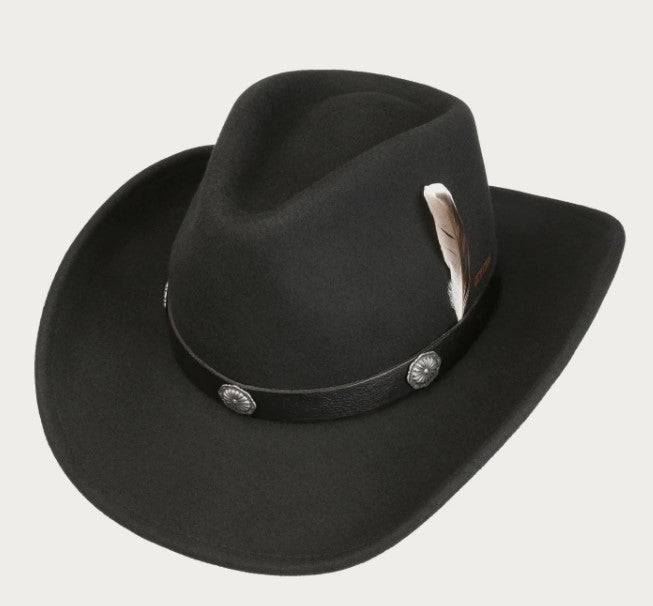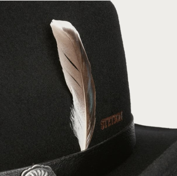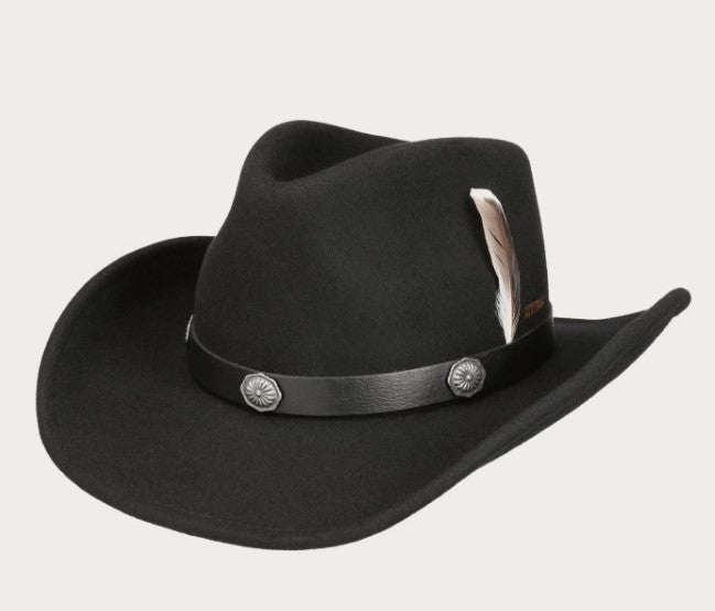 The quality awareness of the Stetson Western hat starts with the choice of material. Wool from Australian sheep, sourced from producers with a focus on animal welfare and from mulesing-free farming, gives the felt hat its dirt-, dust- and water-repellent Asahi Guard® standard. Meanwhile, the brim, which is curved upwards at the sides, ensures a spirited appearance, authentically finished with a leather trim with metal ornaments, feather ornaments and brand lettering.