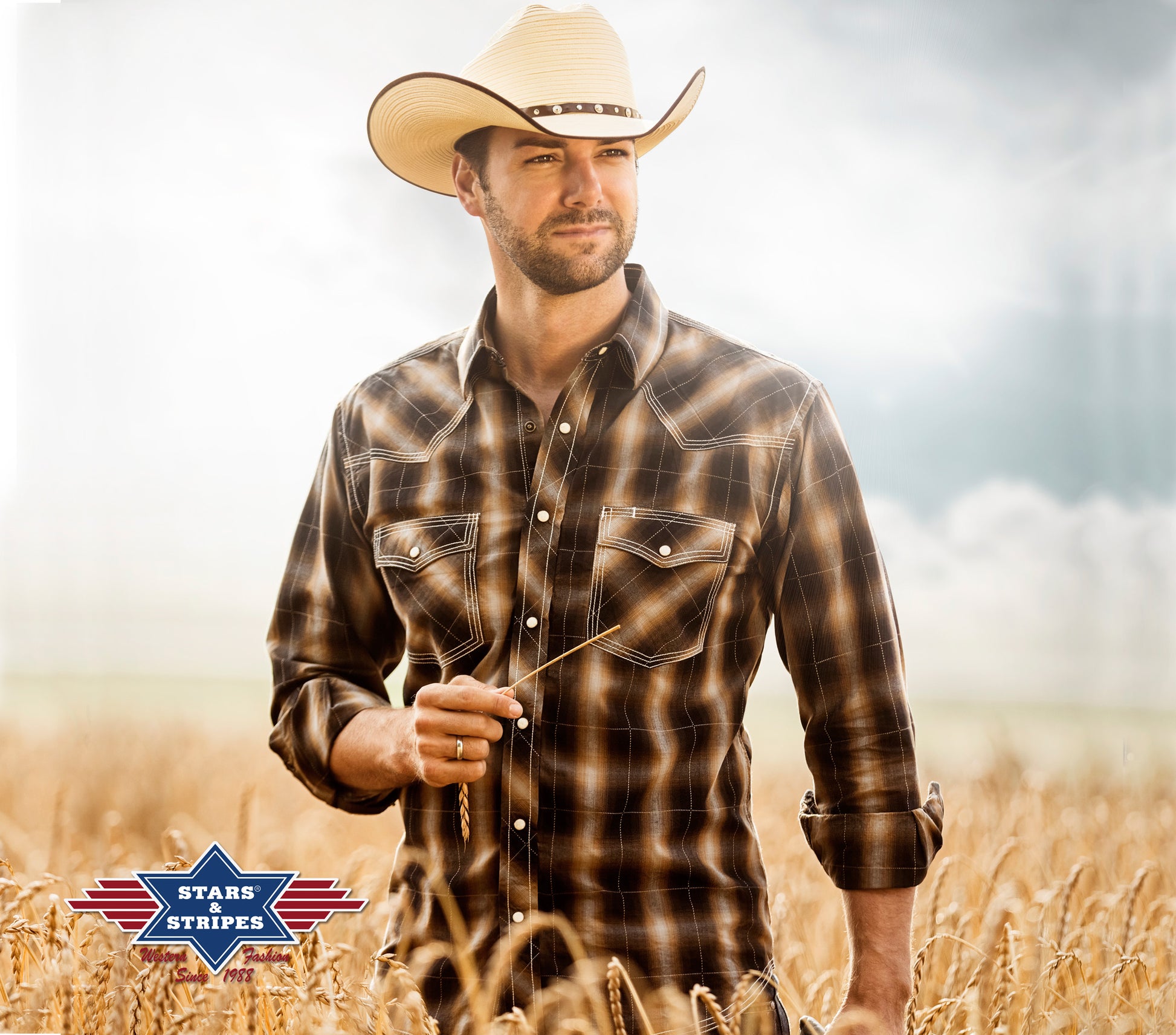 Chequered western shirt with decorative stitching, breast pockets and press studs