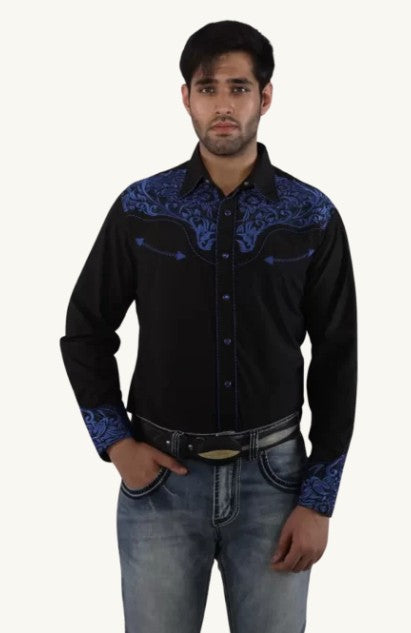 The American West - Baldwin Mens Long Sleeved Embroidered Black with Blue Western Snap Shirt