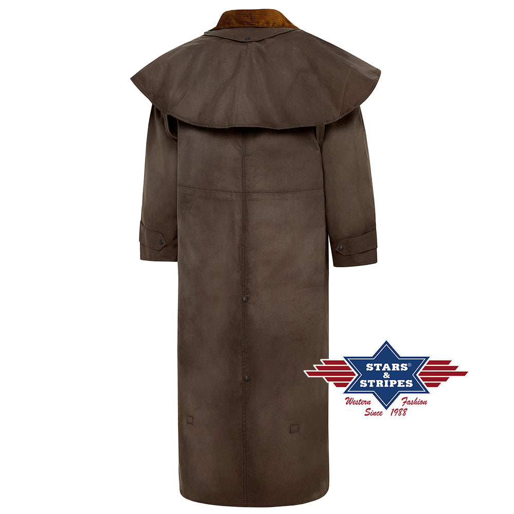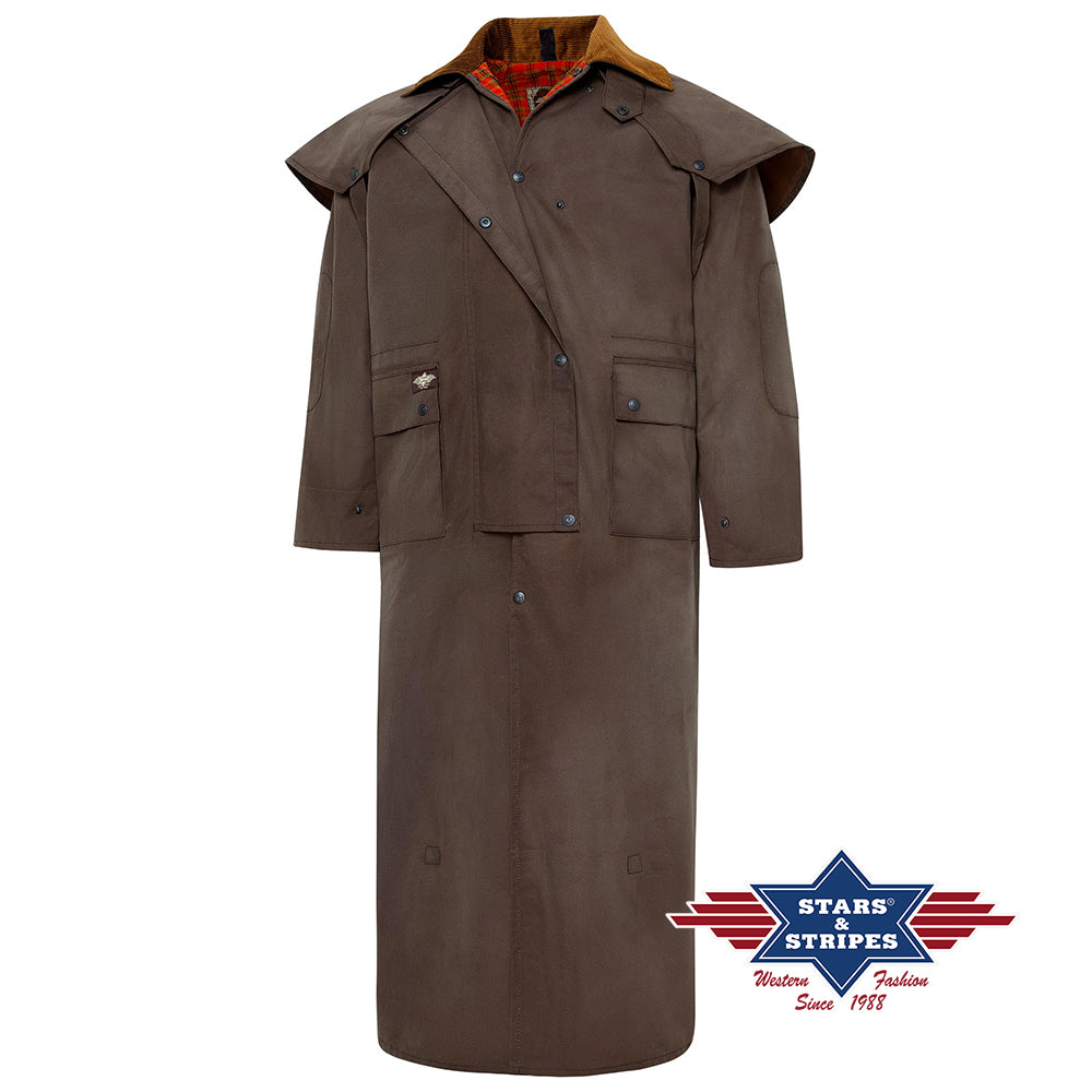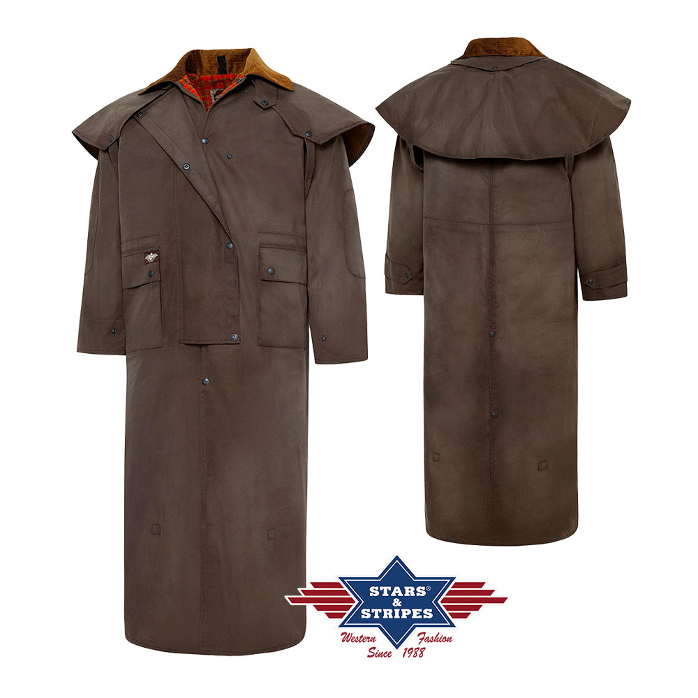 This durable duster is made of sturdy, water resistant 100% cotton and oil cloth and lined with warm flannel.