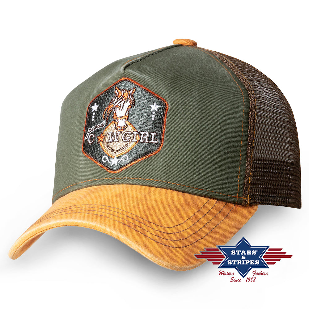 The 3-colour western trucker cap, consisting of 5 panels without a centre seam, is a real eye-catcher. The durable cotton body with a light wash is high-quality and robust. The elaborate embroidery at the front, the airy mesh insert and the visor with used-look wash and 4 decorative seams make the curved brim cap a cool collector's item. It is ideally suited for outdoor activities. The trucker cap has a button covered in cap fabric on the top, which forms the perfect finish. Adjustable in size thanks to the classic snapback closure at the back of the head. This guarantees the perfect fit. A cotton sweatband ensures optimal moisture regulation. The trendy trucker cap in a timeless design can be combined with any style in a versatile way.